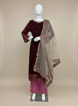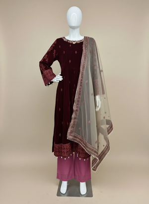 Elevate your festive and formal wardrobe with our Elegant Maroon 3-Piece Velvet Embroidered Maxi Ensemble, designed for grace, sophistication, and timeless charm.