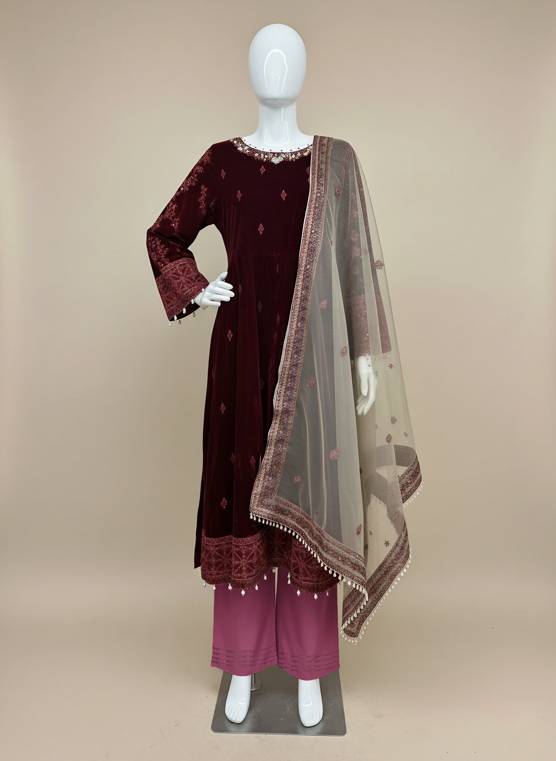 Elegant Maroon 3-Piece Velvet Embroidered Maxi Ensemble