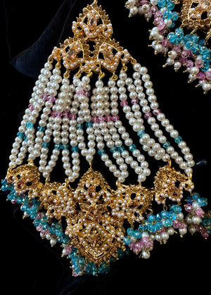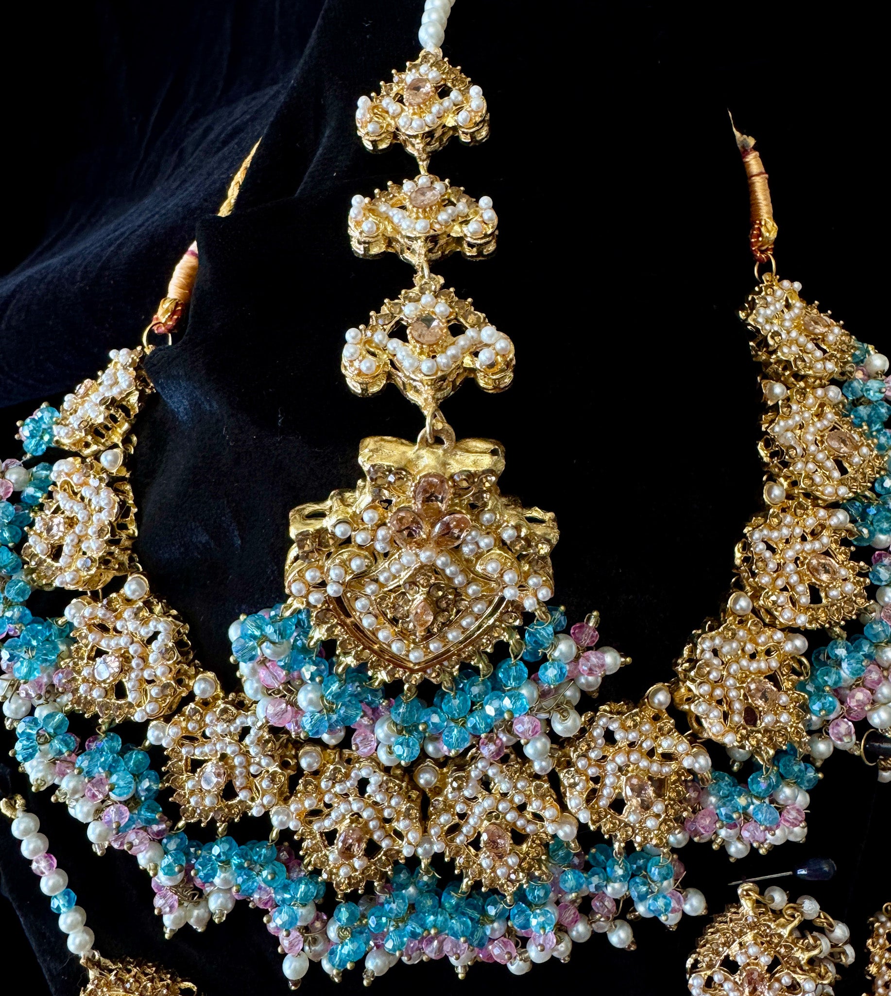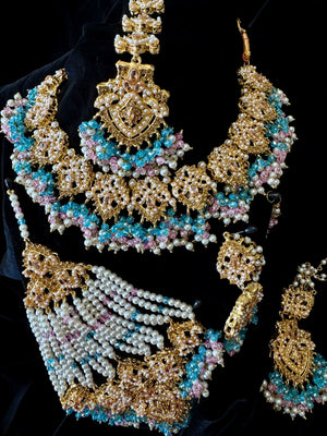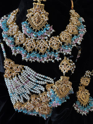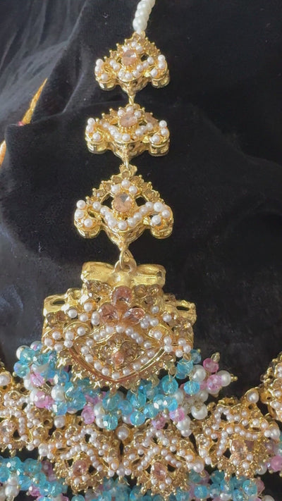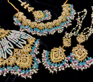 Make a grand statement on your wedding day with this exquisite Indian-Pakistani bridal jewelry set, crafted in Nauratan gold plating for a luxurious and traditional look.