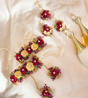 Introducing our stunning 5 piece Gajra set, the perfect addition to your mehndi and mayoun occasion. This set comes in a beautiful combination of red, beige, and brown colors, creating a unique and elegant look that will surely turn heads.