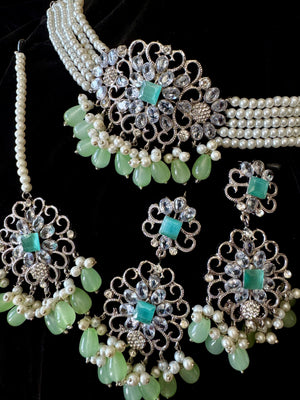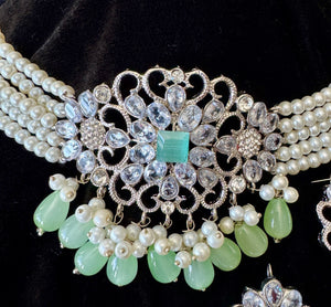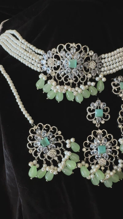 Enhance your look with this stunning choker set, designed with a delicate blend of white and aqua pearls for a soft, graceful touch. Perfect for weddings, festive events, and special occasions, this set adds a touch of elegance to any outfit.