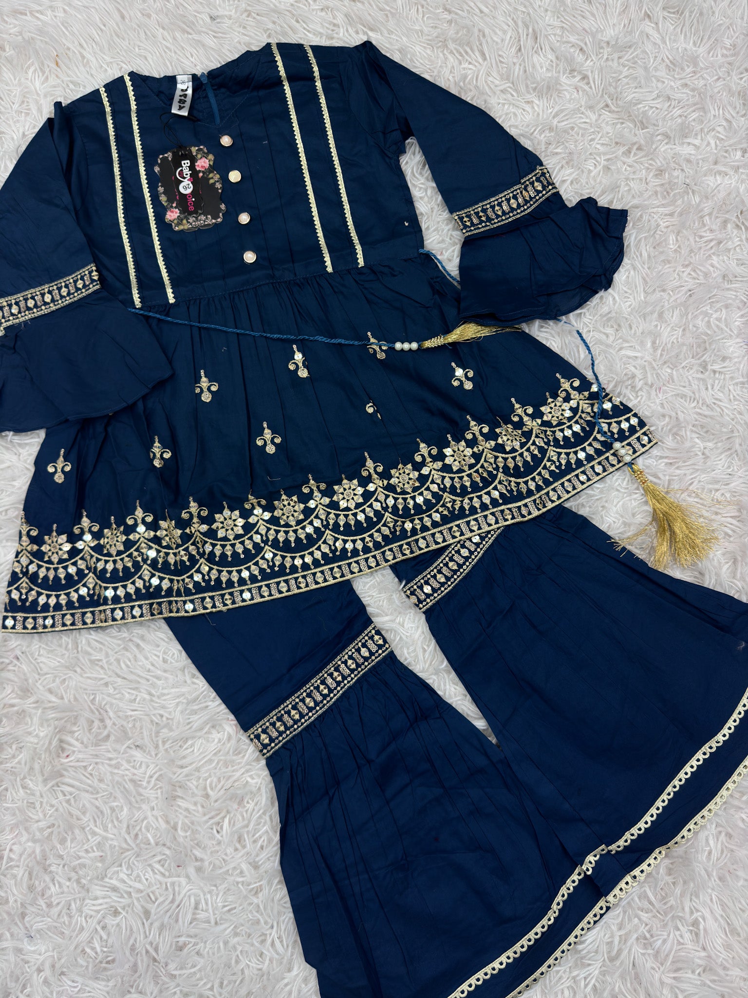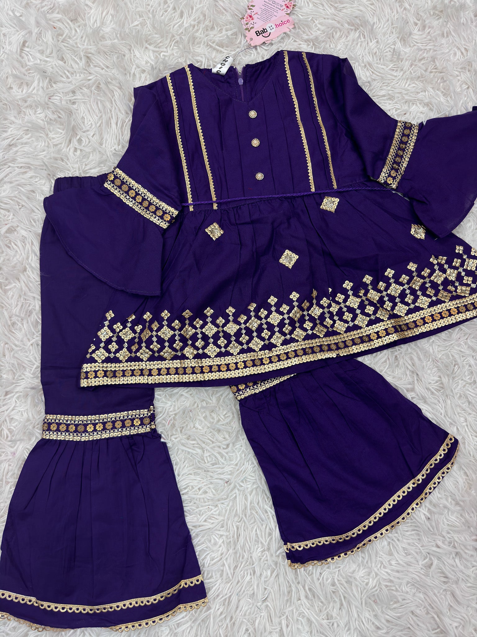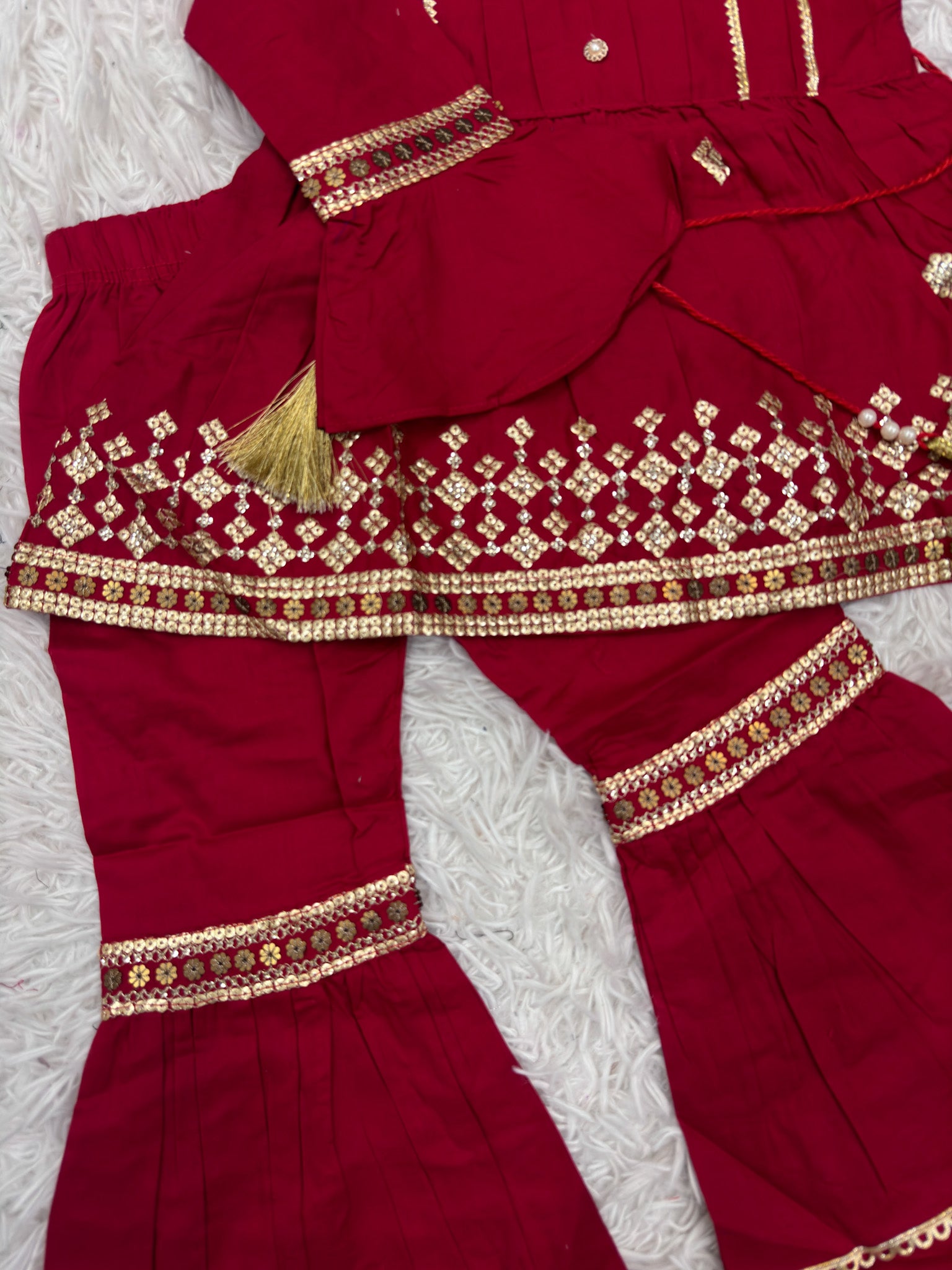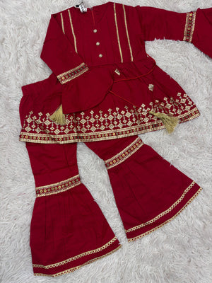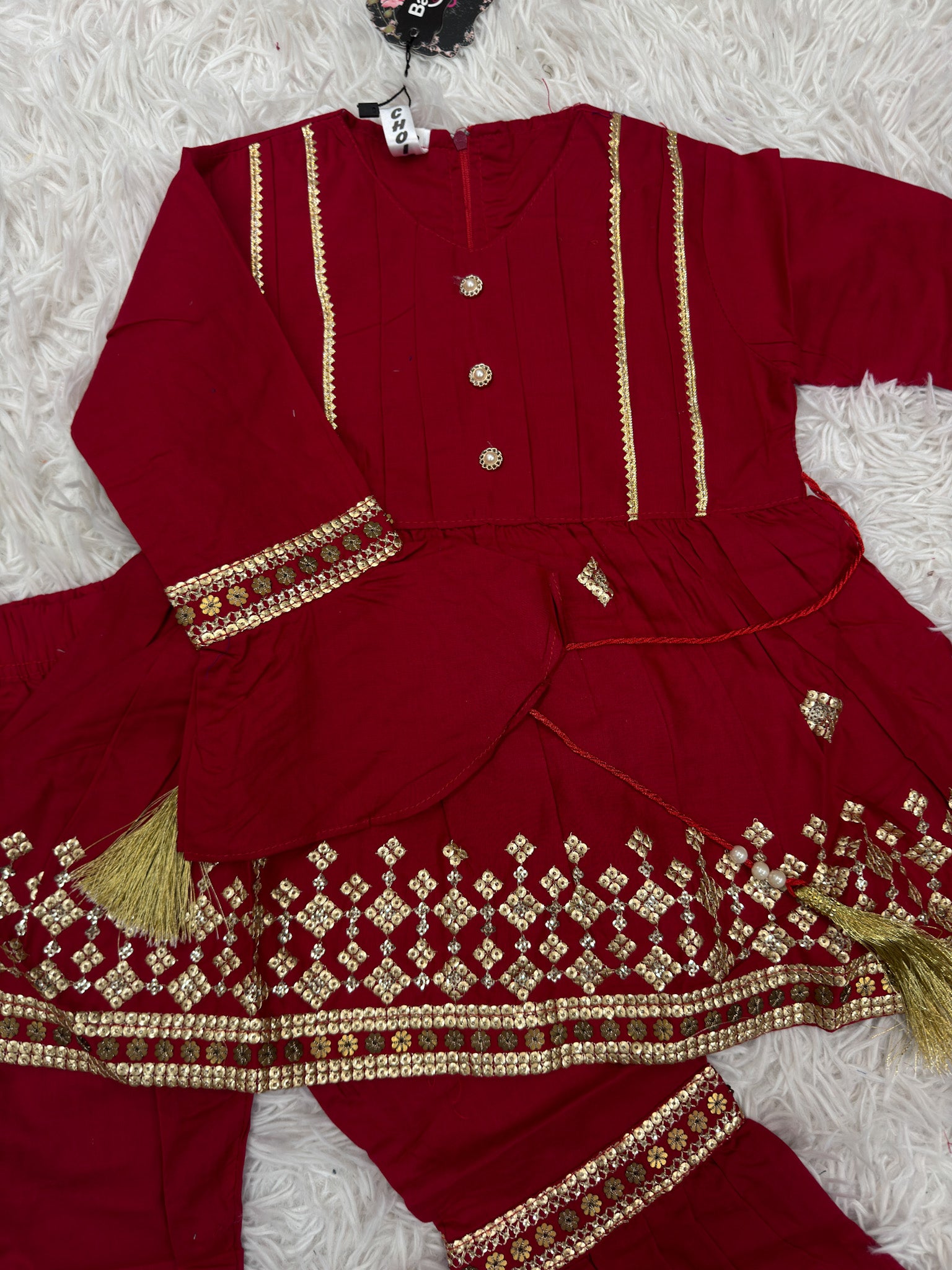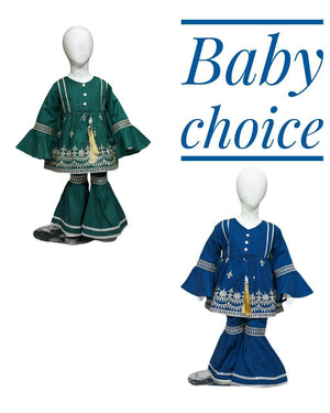 Explore the elegance of traditional wear with Baby Choice, available at Maryam Qasim Boutique. These soft cotton 2-piece Gharara outfits are beautifully crafted with intricate mirror embroidery*, gota lace, and sequin detailing. The adjustable belt ensures a comfortable fit, while the convenient back zipper makes dressing easy. Perfect for any occasion, these outfits blend style and comfort, making them an ideal choice for your little ones.