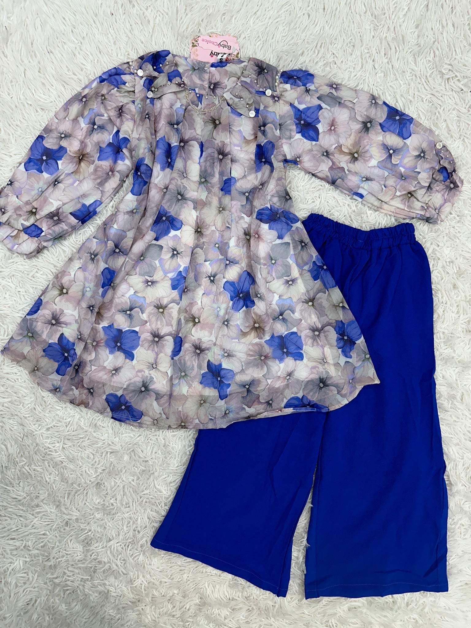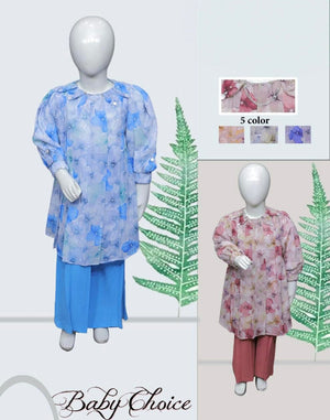 Elevate your child’s wardrobe with the elegant Baby Choice 2-Piece Chiffon Outfit, featuring a stylish double georgette palazzo. The outfit is beautifully designed with intricate neck and sleeve details, adorned with nug buttons and a silver chain for a sophisticated touch. The shirt is stitched with lining, ensuring comfort and a refined look. This versatile ensemble is perfect for both formal and casual occasions, making it a must-have for your little one. Available now at Maryam Qasime Boutique!