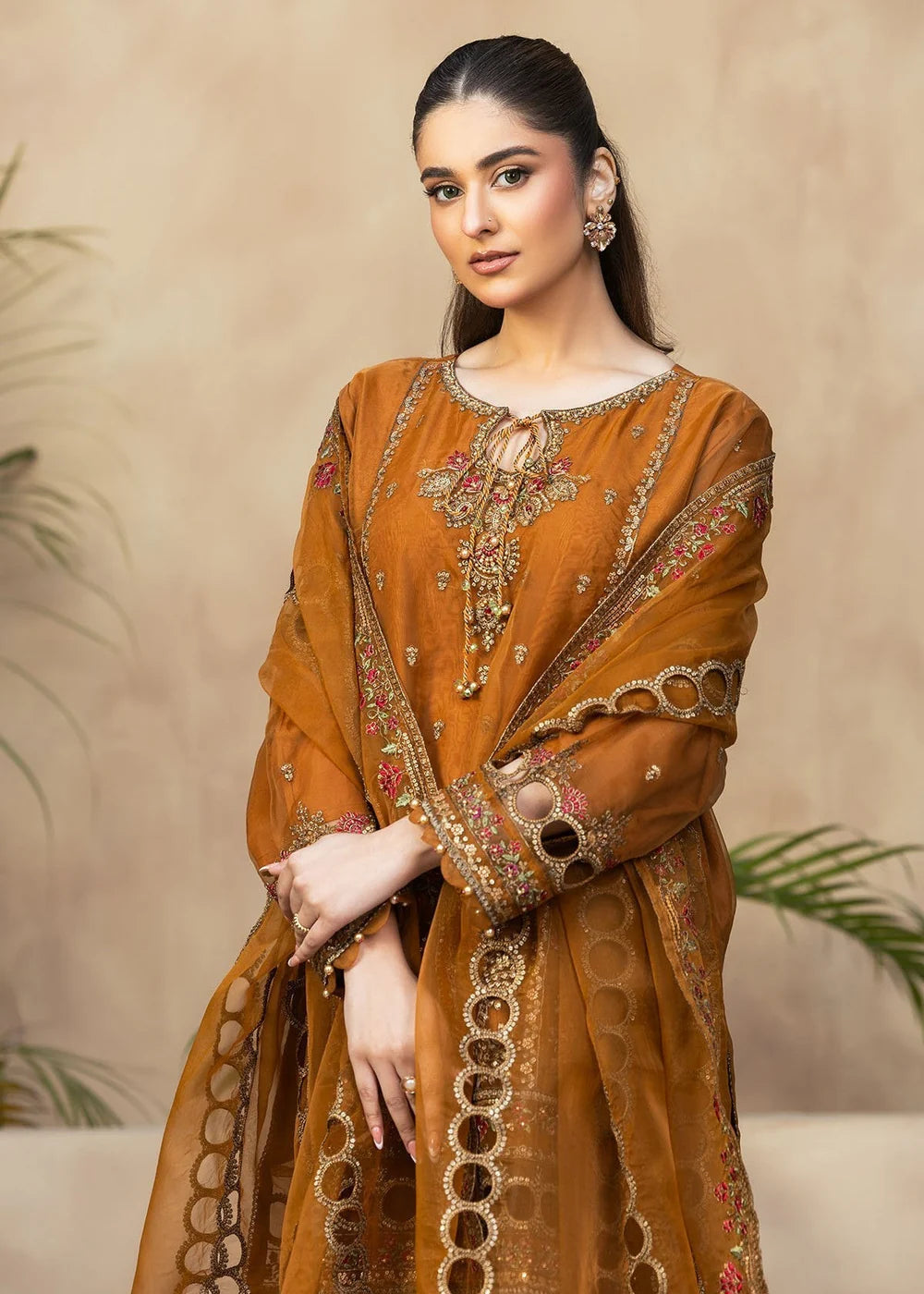 Bin TayyabBin Tayyab Rustic Brown Organza Short Kurta Set with Embroidery & Crinkle Dupatta – 3 Piece