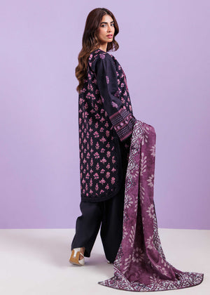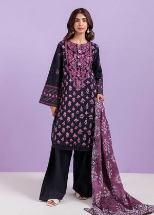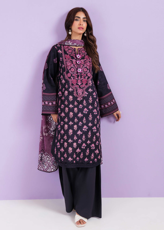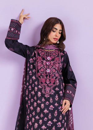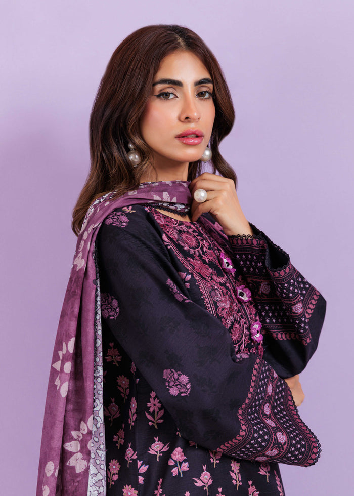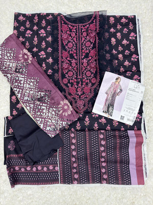 Immerse yourself in elegant tradition with this unstitched floral ethnic ensemble in a rich plum and black palette. Delicate rose and vine motifs bloom across the dark canvas, framed by intricate ethnic borders and finely detailed embroidery. Paired with a printed dupatta featuring classic patterns in tonal harmony, this design captures the essence of cultural heritage with a modern, sophisticated flair.