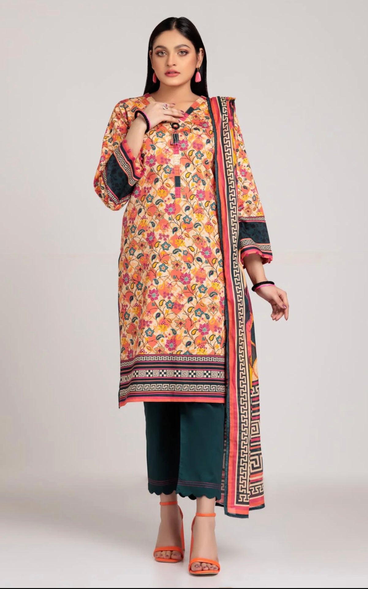 This suit comes in its original package, ensuring that you receive it in pristine condition. The package includes a stylish kameez, a comfortable shalwar, and a matching dopotta that will complete your sophisticated look.