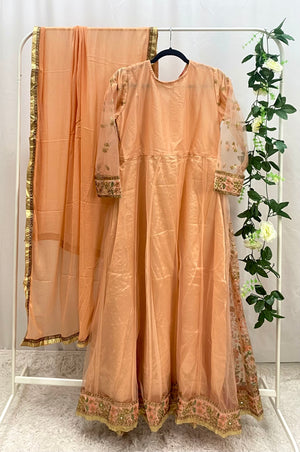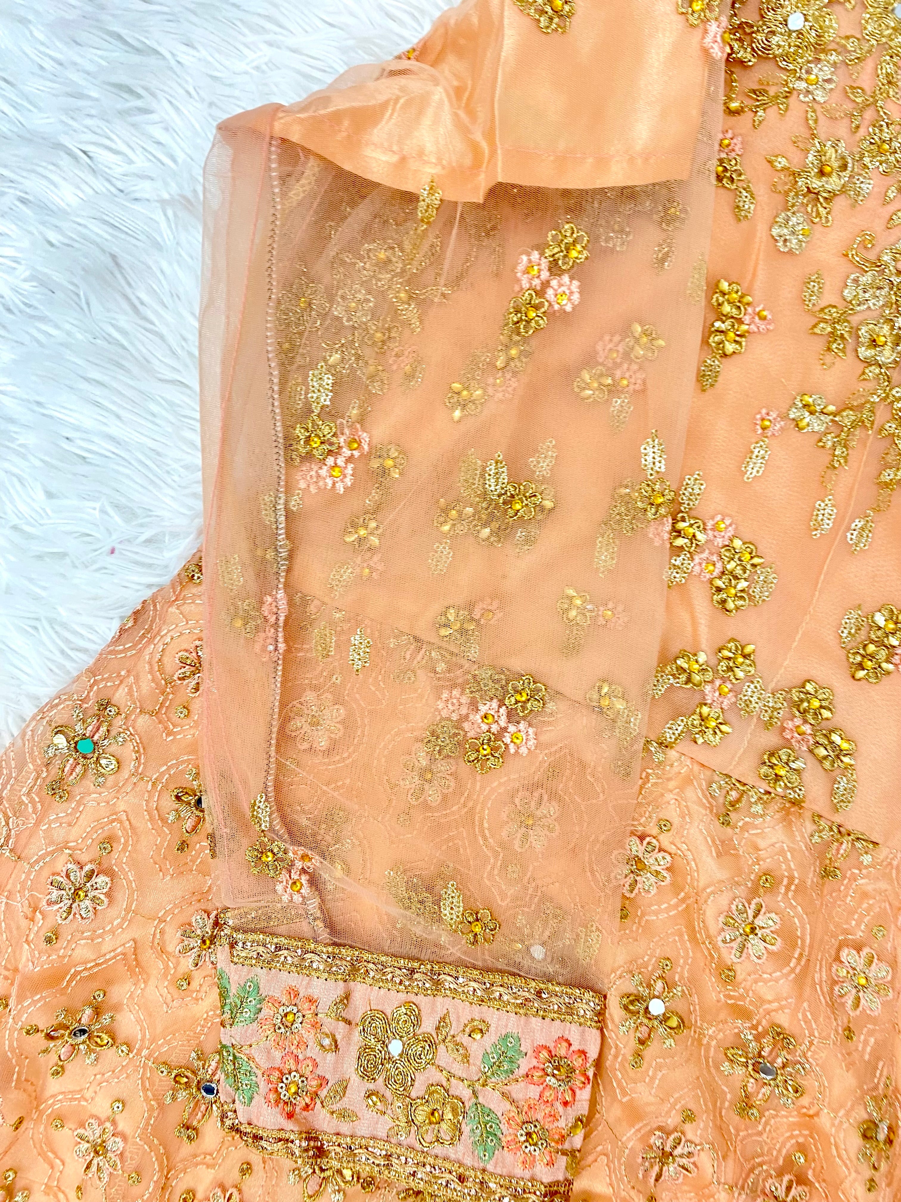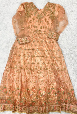 Beautiful Peshwash style maxi Suit consisting of Zari and thread work the front of the suit and sleeves are completely embroidered with mirrors, beads and sequins.