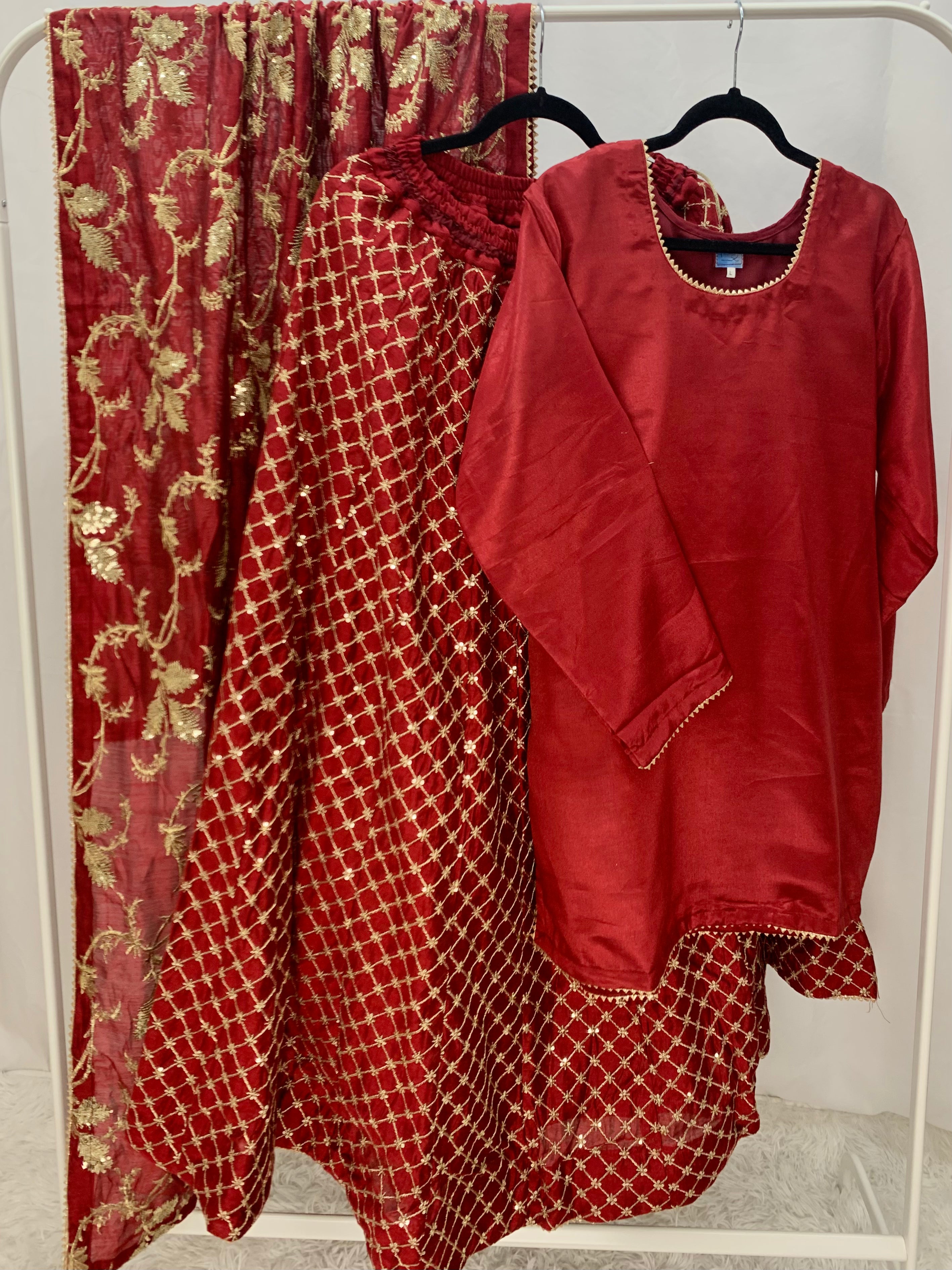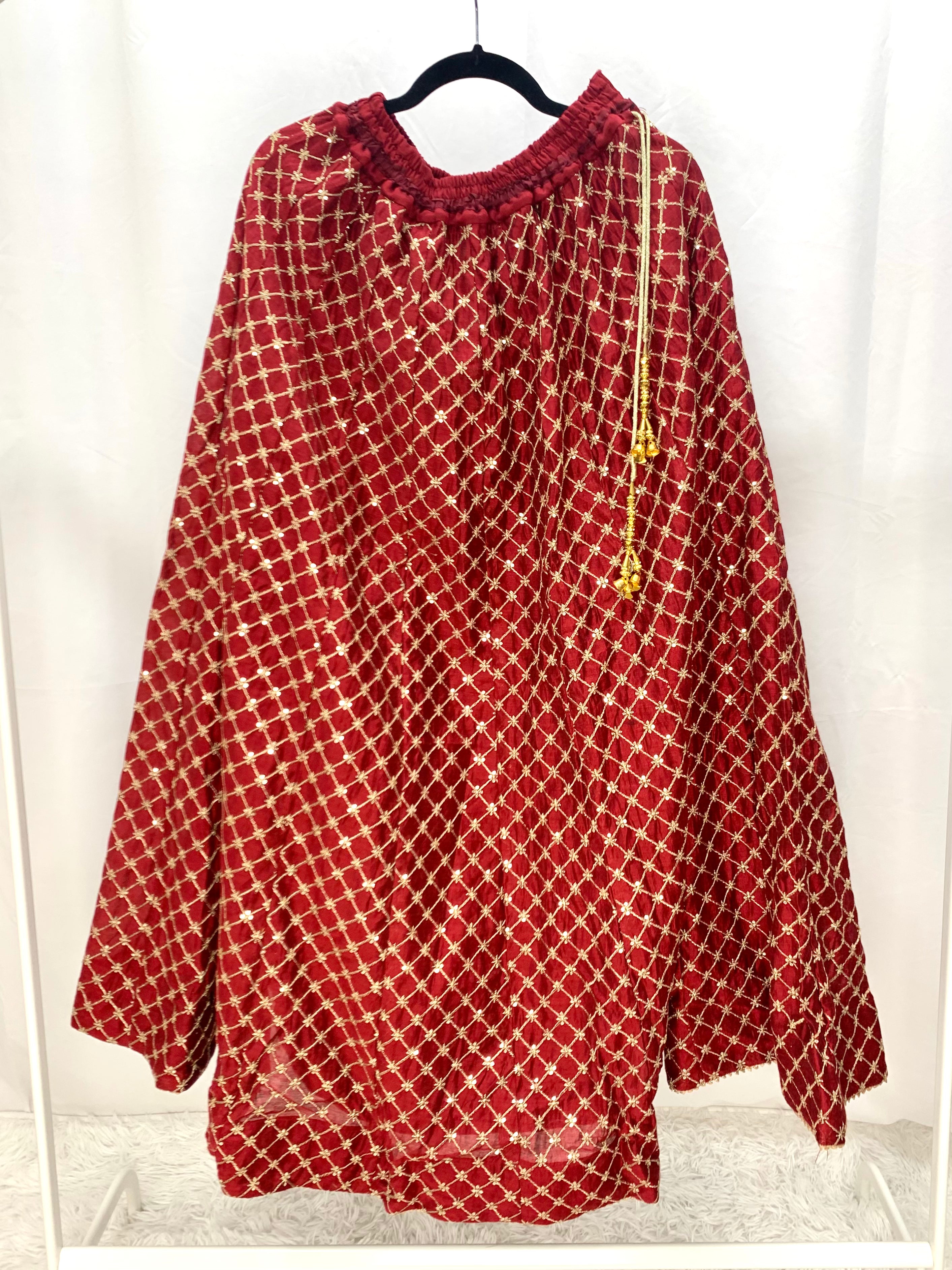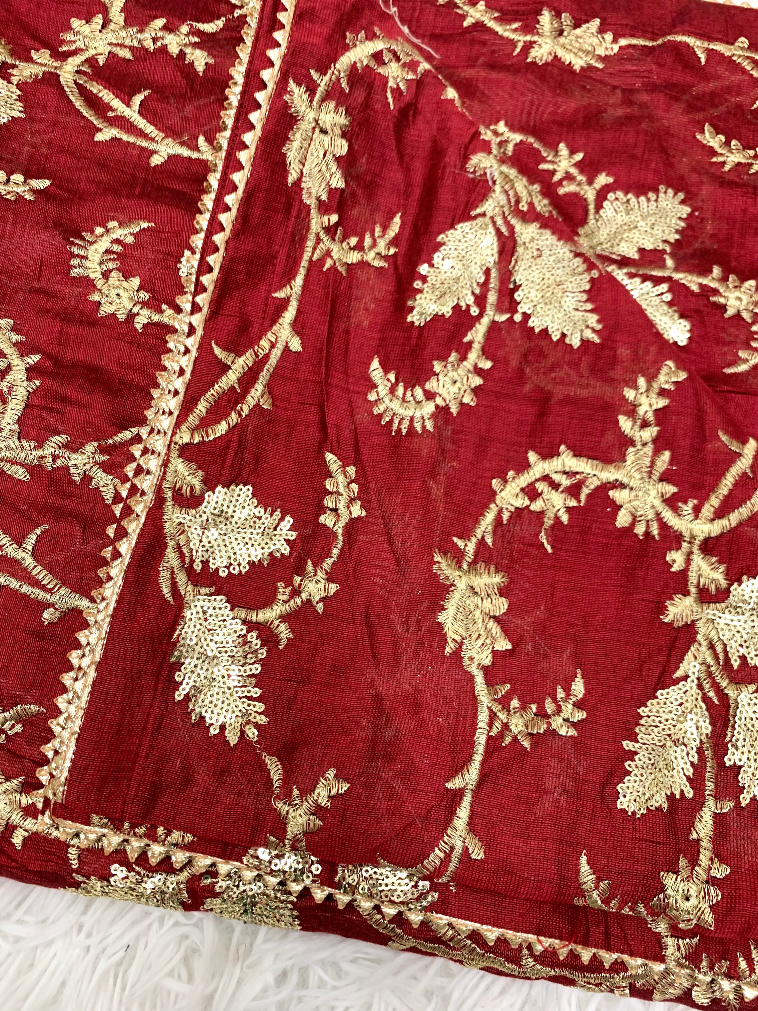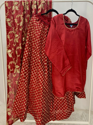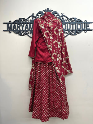 Beautiful 3 pcs Lehnga in ruby red, comes with plain shirt, Embroidered Lengha and Embroidered Dupatta