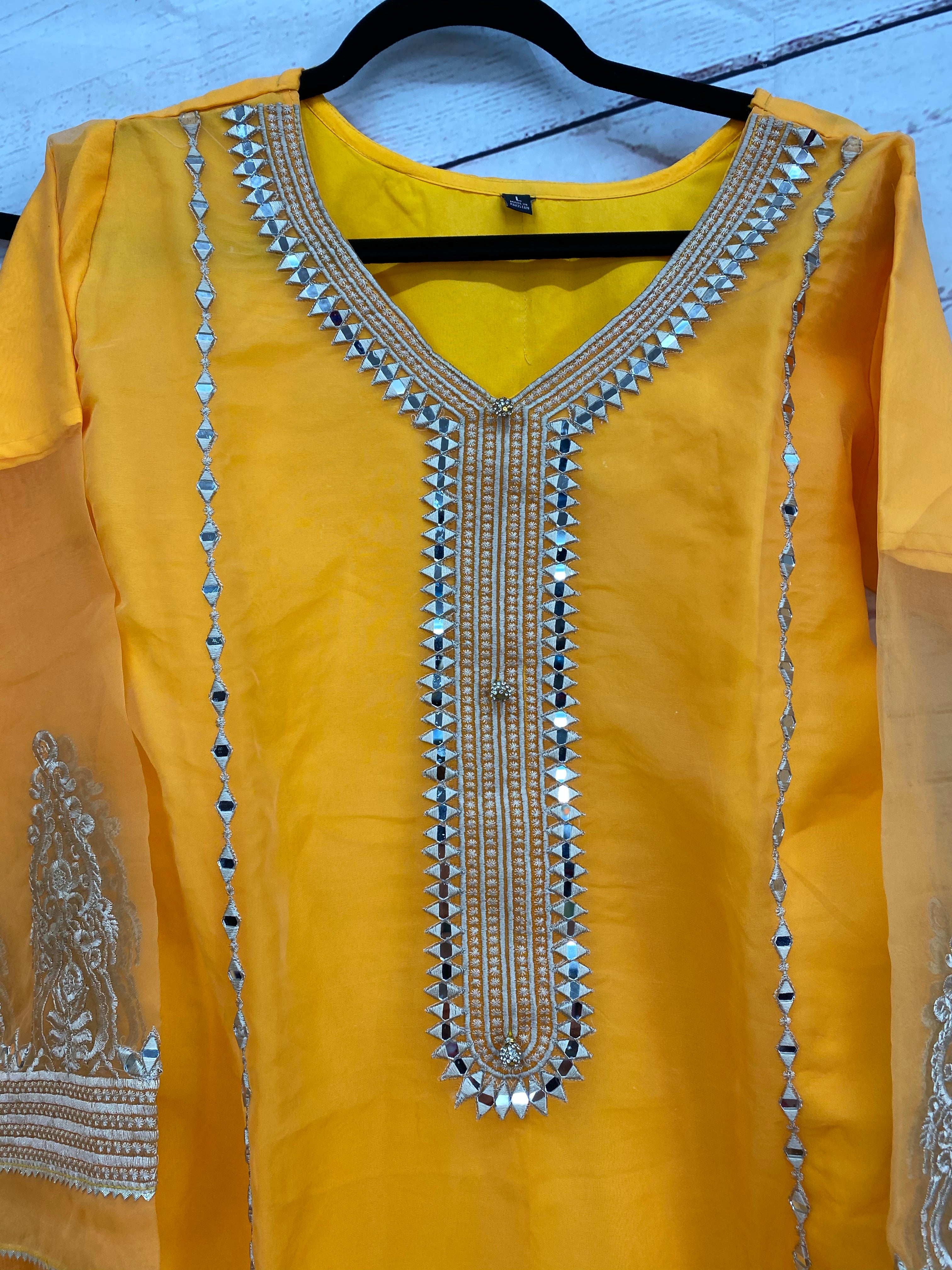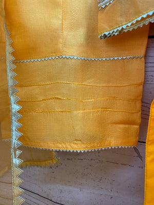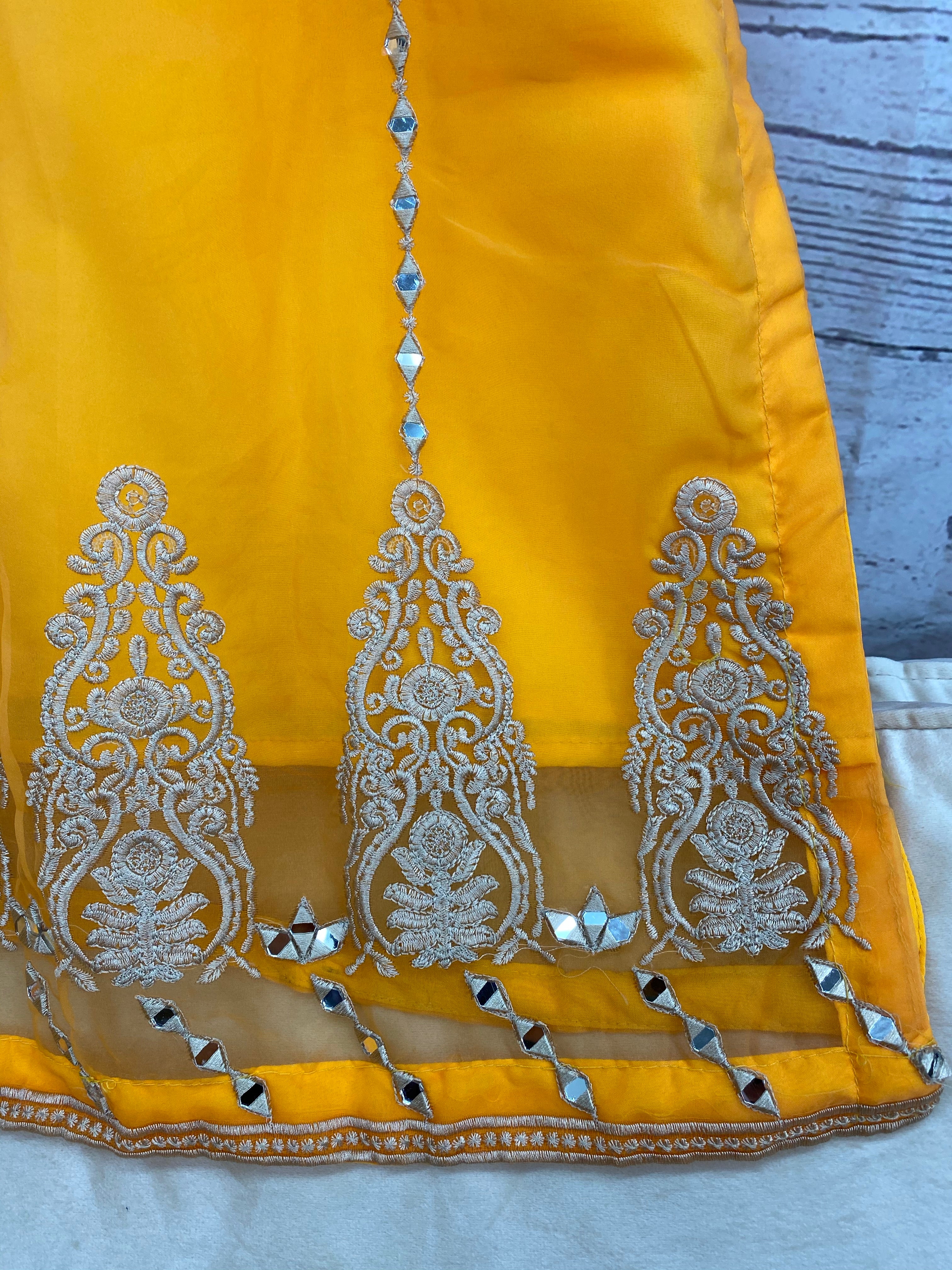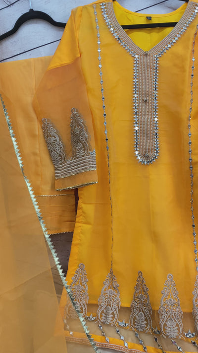Orange shade thread and mirror work done on this Organza shirt, with an organza Dupatta with gota lace all around, and a fancy raw silk trouser. Made with high quality materials and beautifully crafted, can be worn for any event
