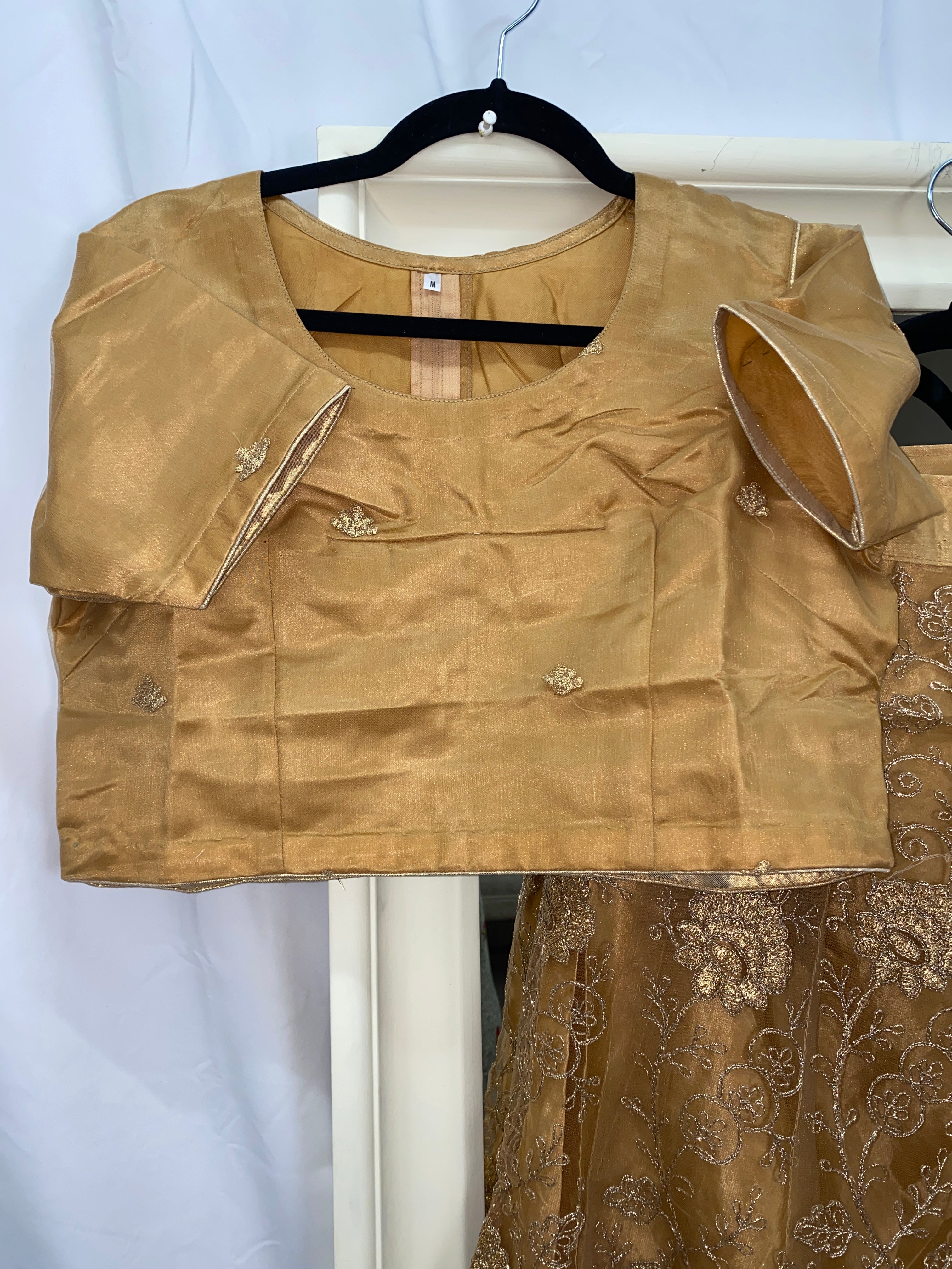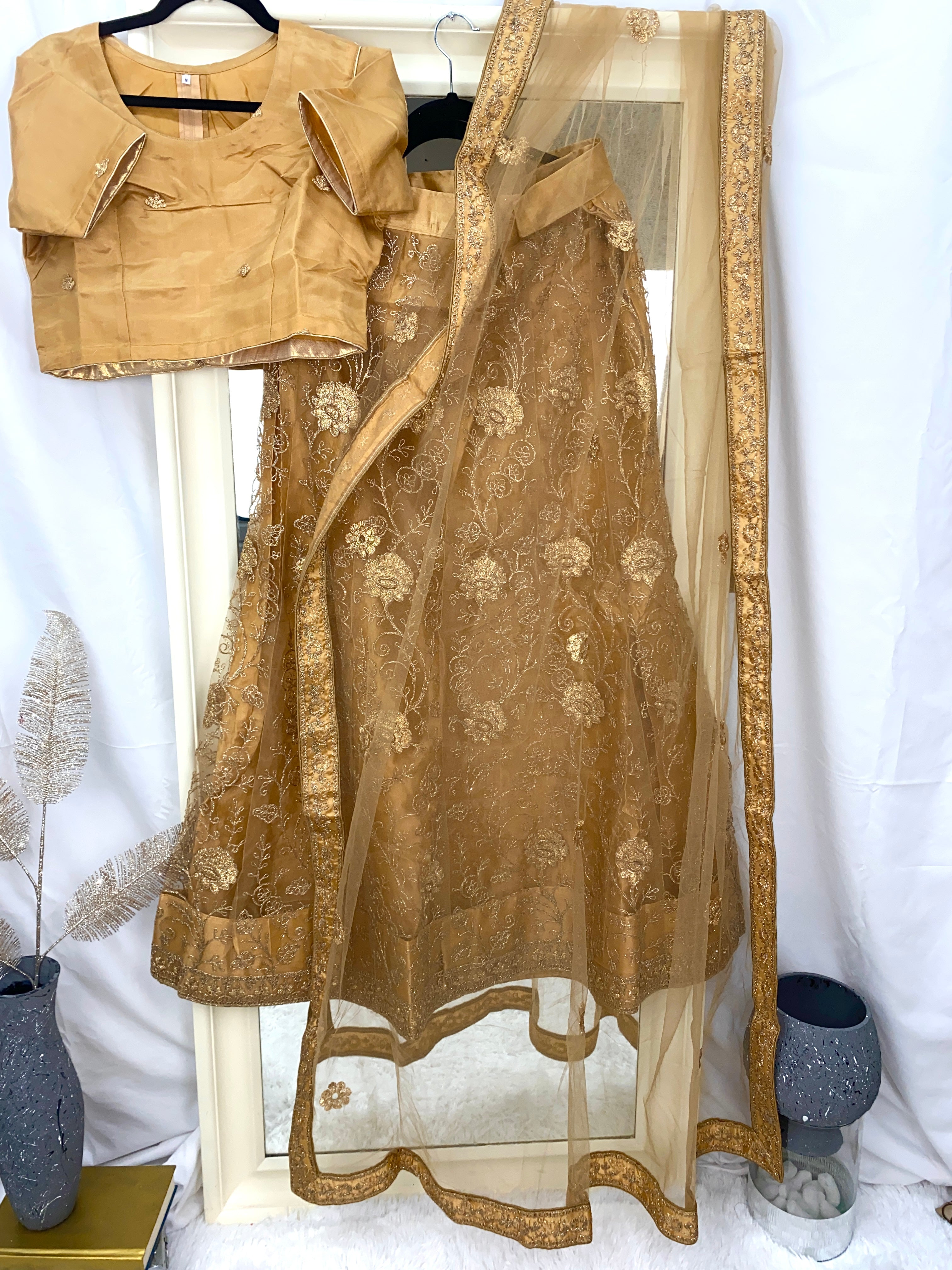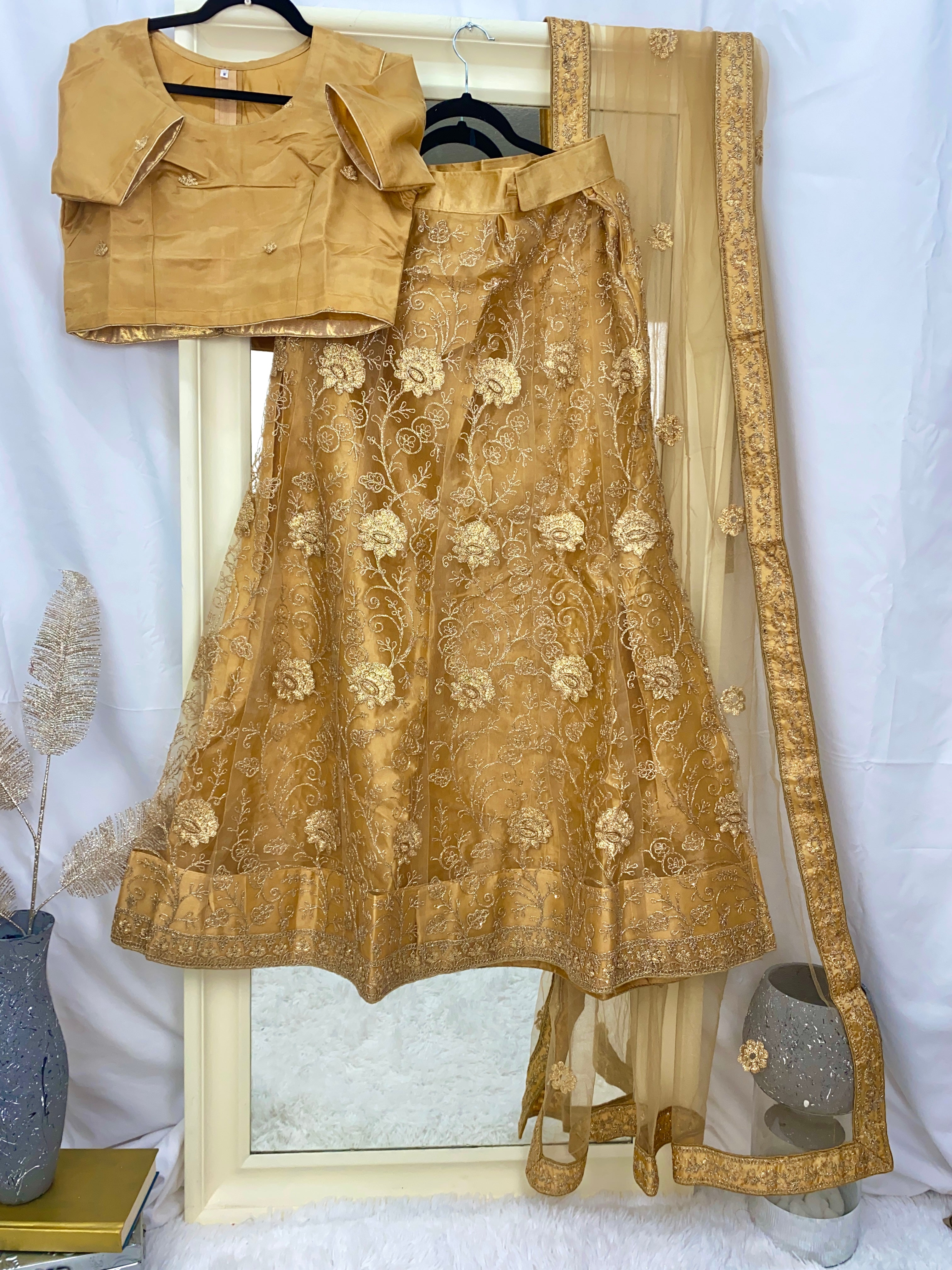 Stunning Brownish Gold Lehenga with gold accents. Net lehenga with Net and silk blouse, zari embroidery work. Net Dupatta with 4-side border. Made in a medium size, but can be made up to a XL size after alterations.