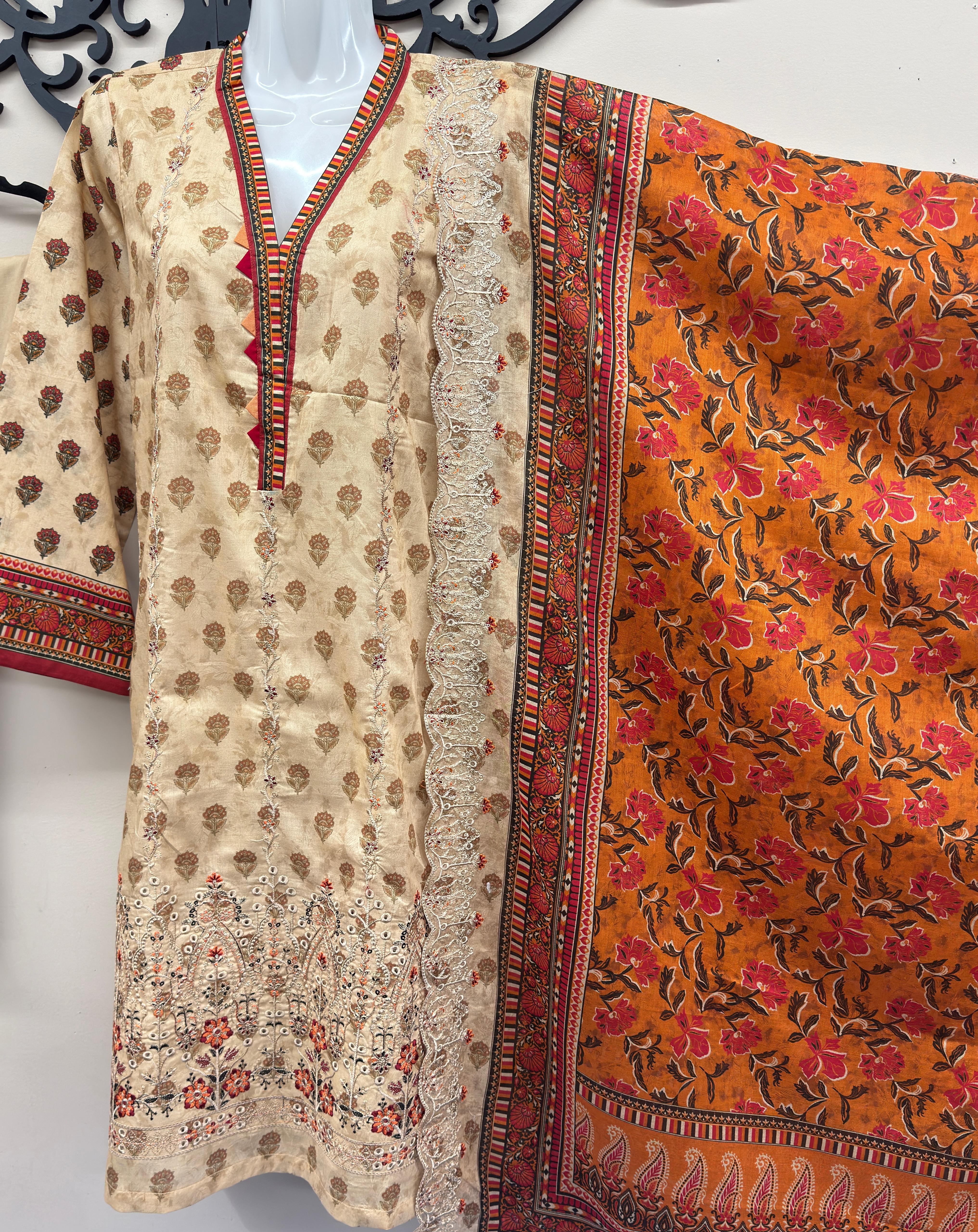 3 Pcs Lawn Embroidered Suit for Women – Printed Shirt with Plain Shalwar & Embroidered Dupatta