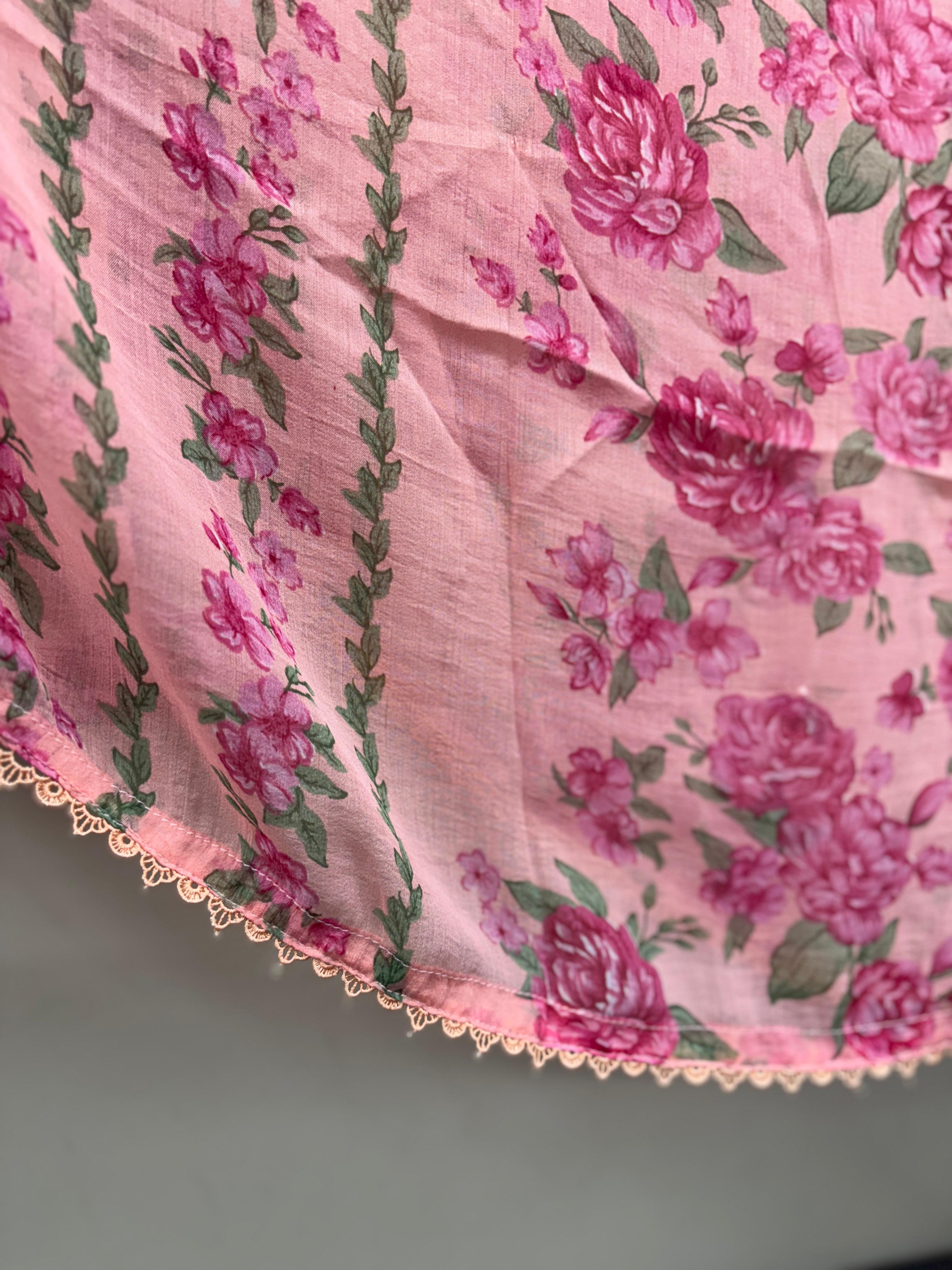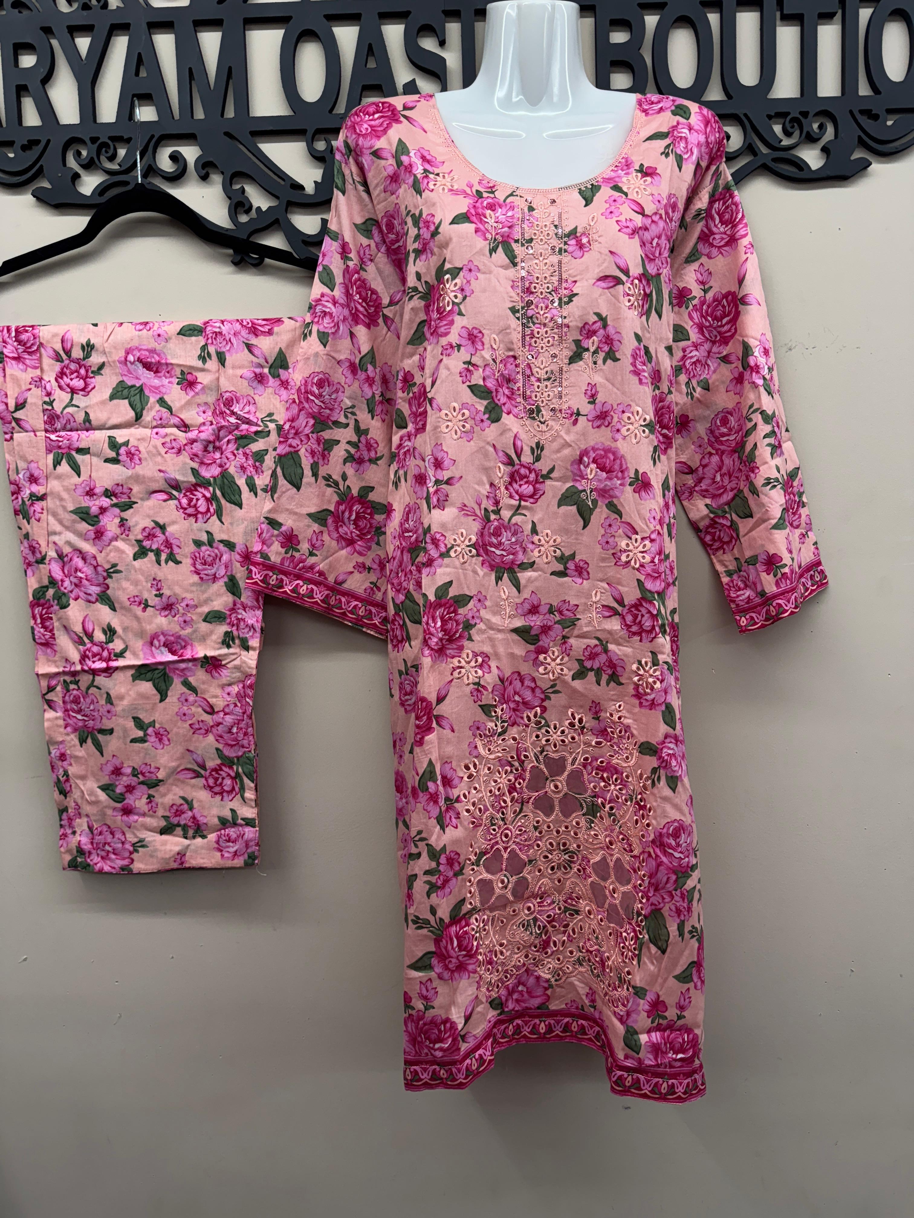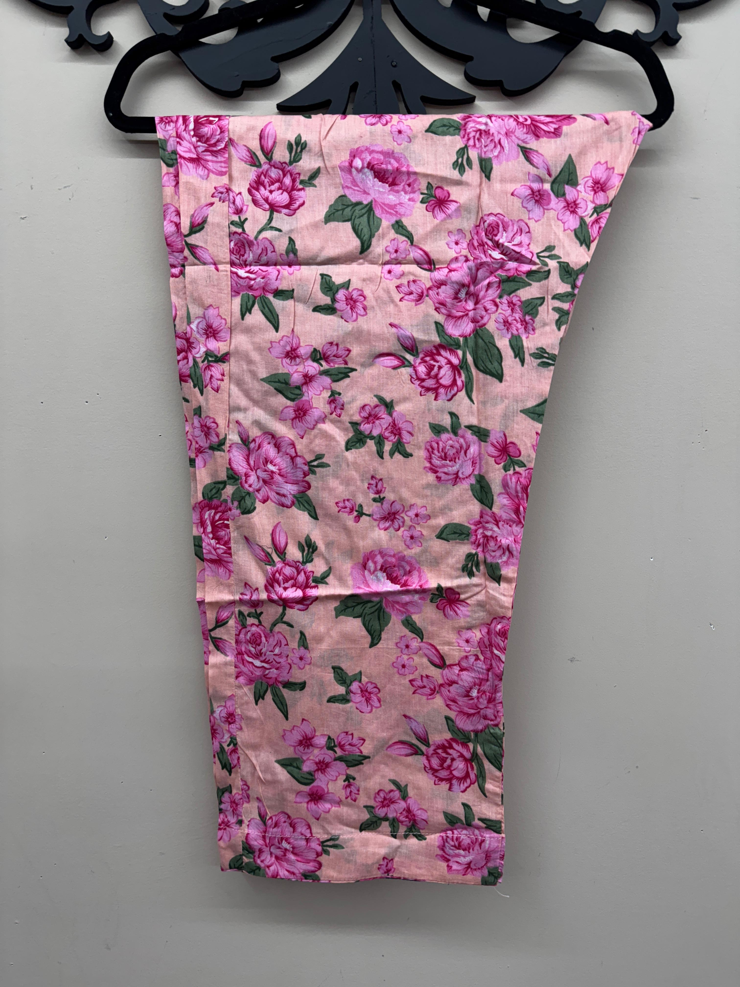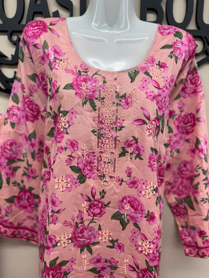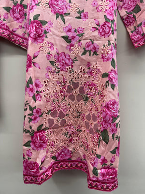 Step into effortless elegance with this pink floral 3-piece lawn outfit crafted for style and comfort. The shirt showcases a colorful floral print with an embroidered neckline, paired with matching lawn trousers for a coordinated look. A full-size chiffon printed dupatta with 4-side black lace completes this graceful outfit. Made from non-see-through breathable fabric, it’s the perfect choice for summer wear. Manufactured by Erum Eman