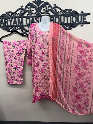 Pink Floral 3-Piece Lawn Suit with Embroidered Neck & Chiffon Dupatta