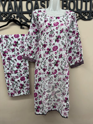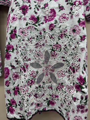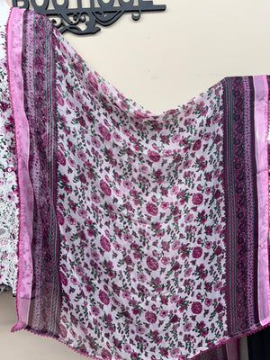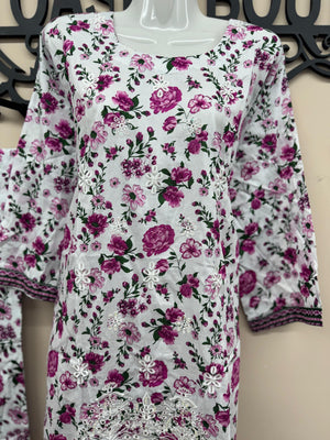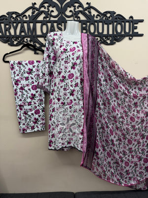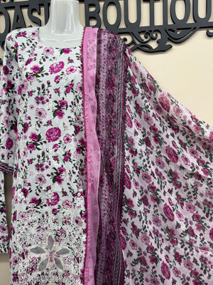 White & Pink Floral 3-Piece Lawn Suit with White Embroidery & Chiffon Dupatta