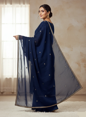 Elevate your outfit with this elegant navy blue chiffon dupatta, featuring delicate peach and golden embroidery. Lightweight, flowy, and perfect for festive occasions or traditional wear.
