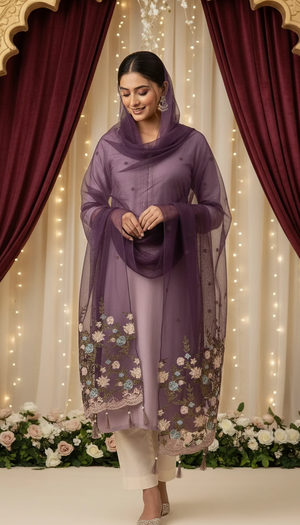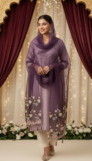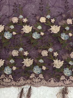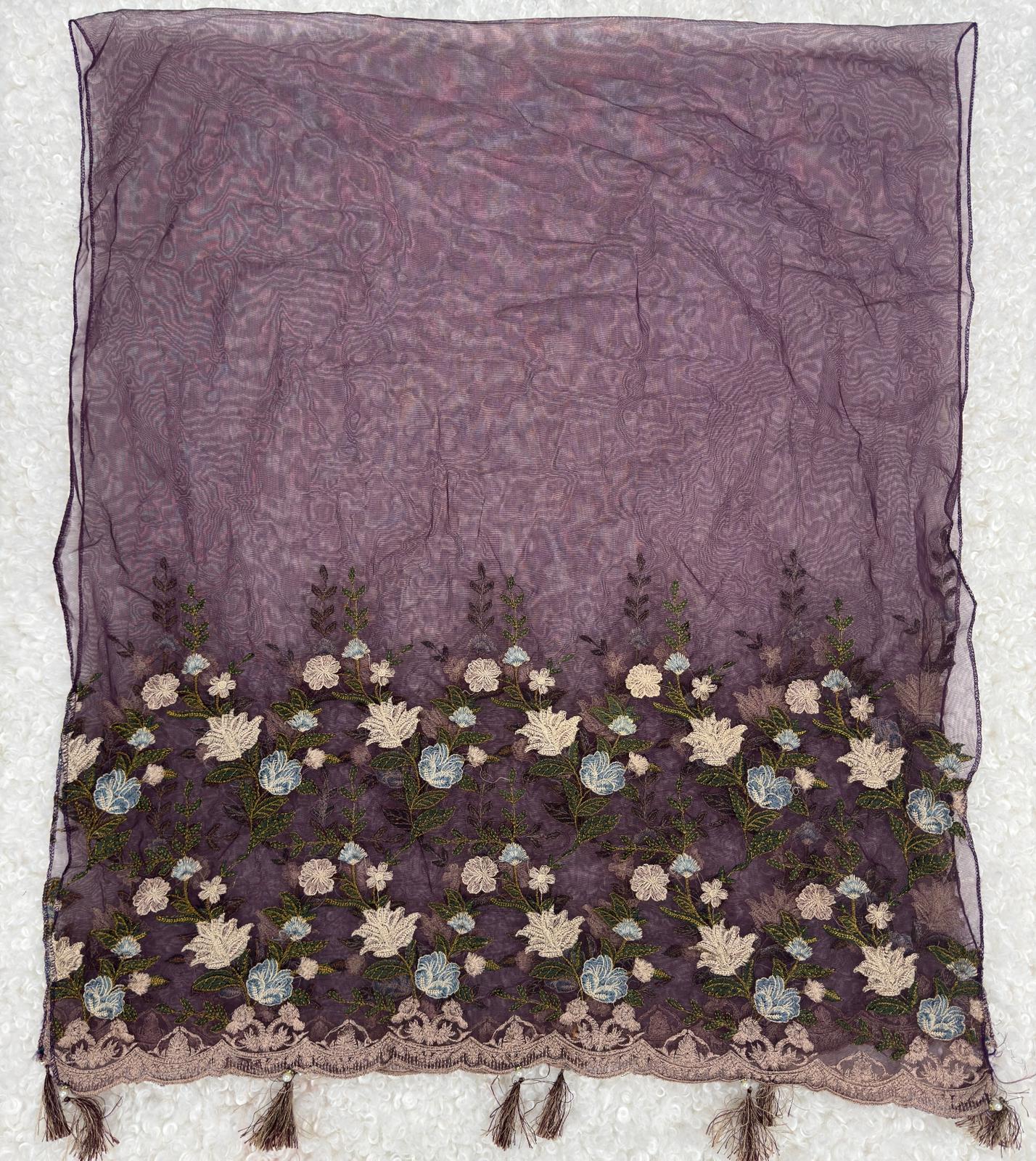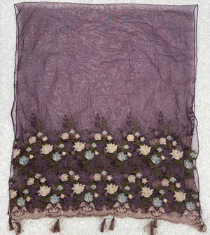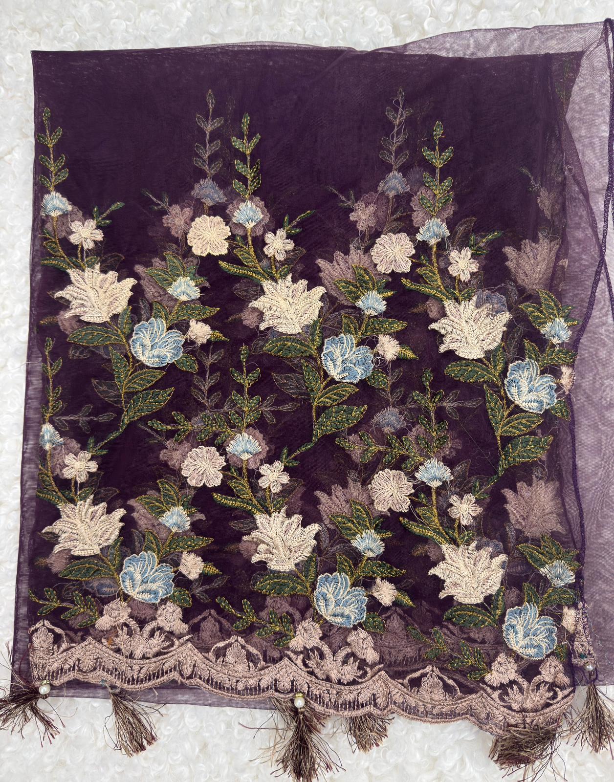 Graceful purple net dupatta featuring delicate embroidery work. Lightweight and stylish, perfect for weddings, parties, and formal occasions.