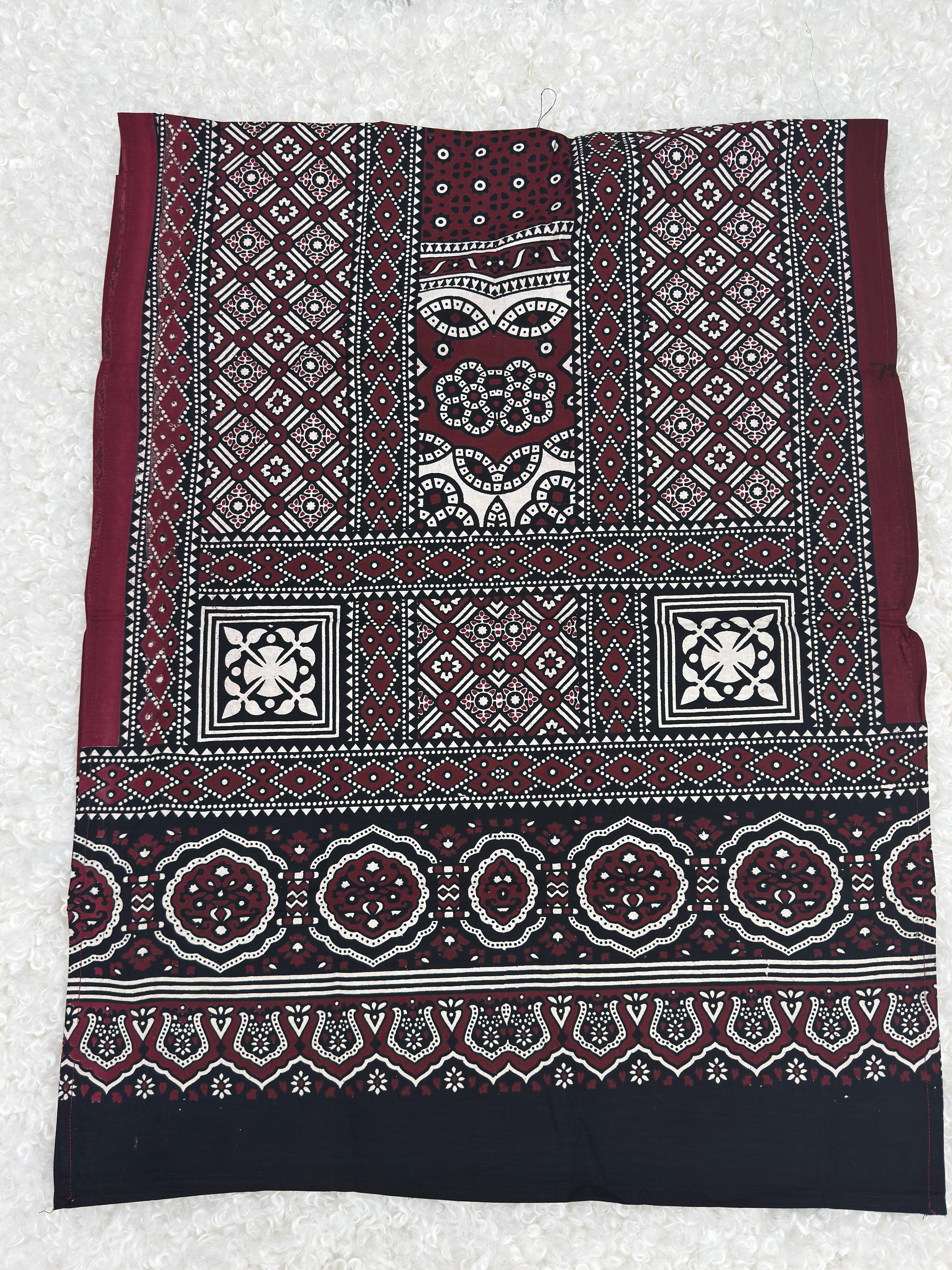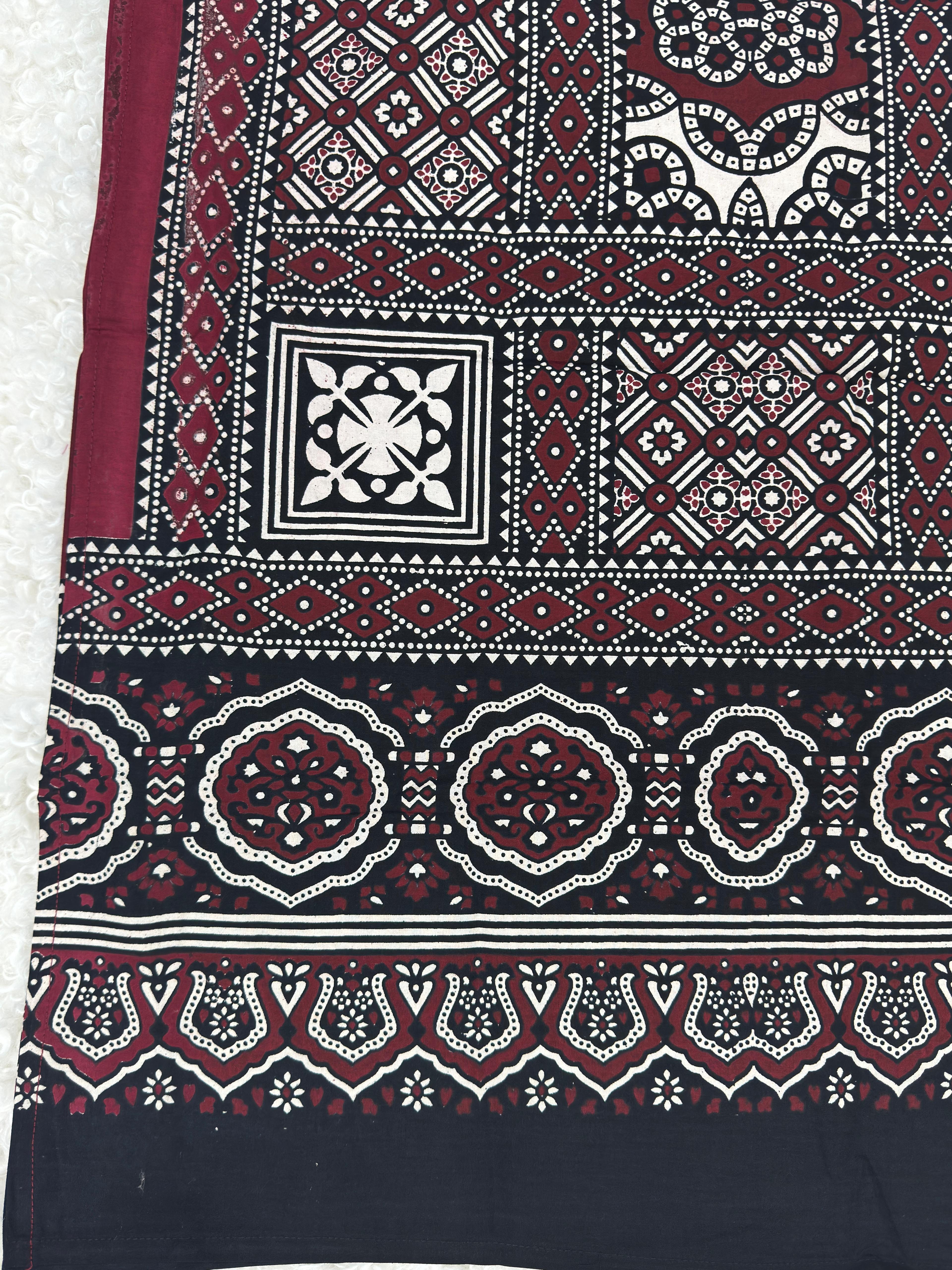 Authentic small-sized cotton Sindhi Ajrak dupatta featuring traditional block print designs. Soft, breathable, and perfect for casual or ethnic wear. Size: 67” × 25”.