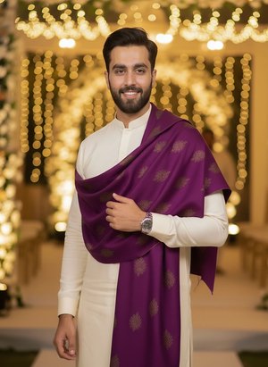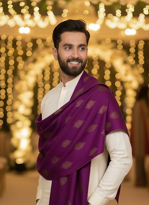 Add a royal touch to your traditional attire with this Original J. Purple Shawl, ideal for grooms and special wedding occasions. Expertly woven with golden jacquard patterns, this 2.5-meter shawl elevates any sherwani or shalwar kameez, giving a look of pure elegance and sophistication.