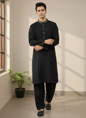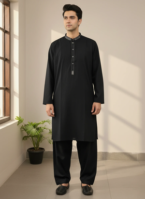 Comes with a traditional shalwar, paired with a kameez that has simple, button-less cuffs for a classic, traditional appearance.