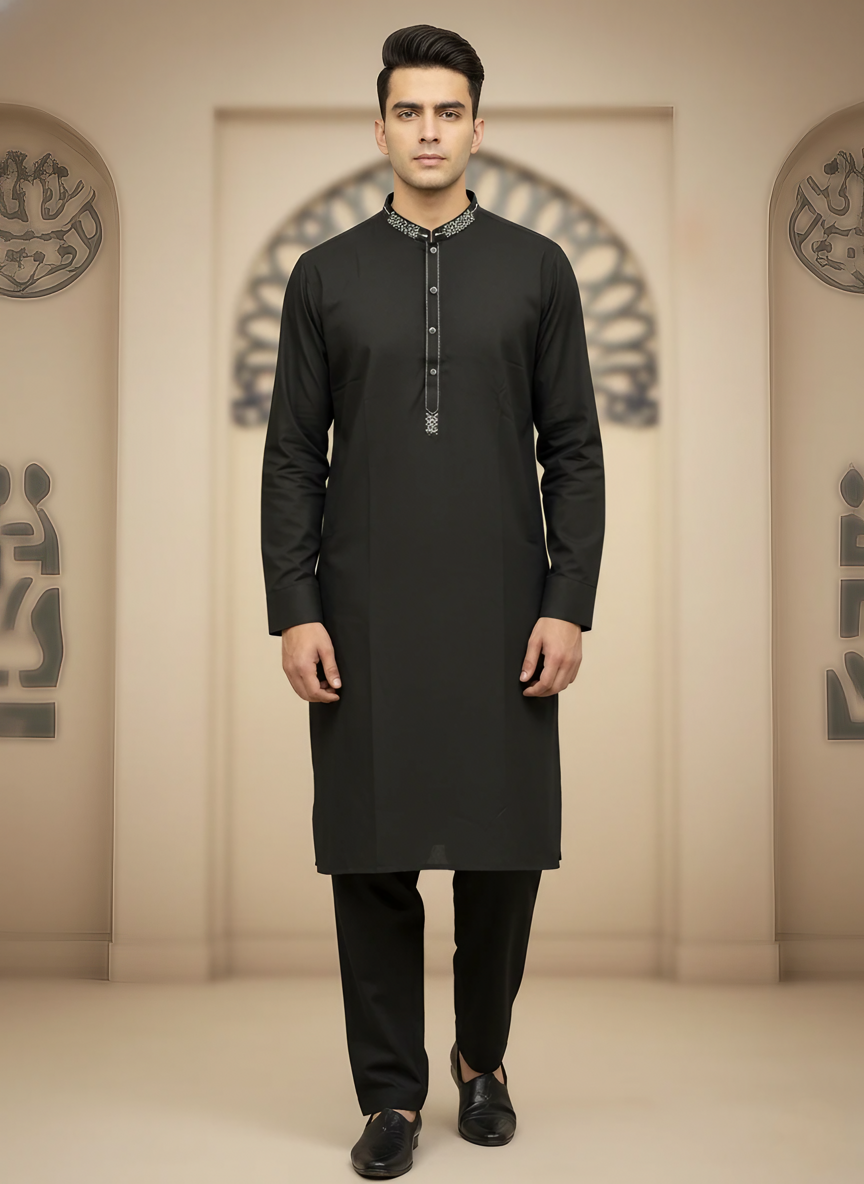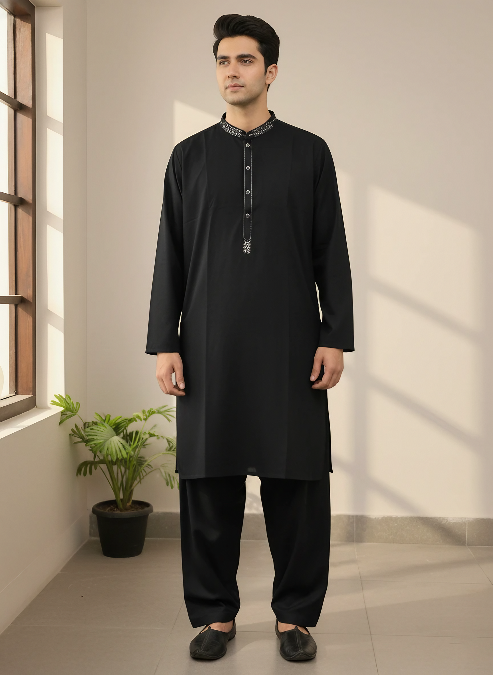 Comes with a tailored trouser featuring side pockets, paired with a kameez that has stylish buttoned cuffs for a modern, polished look. -