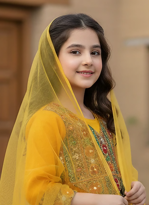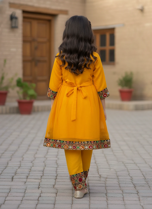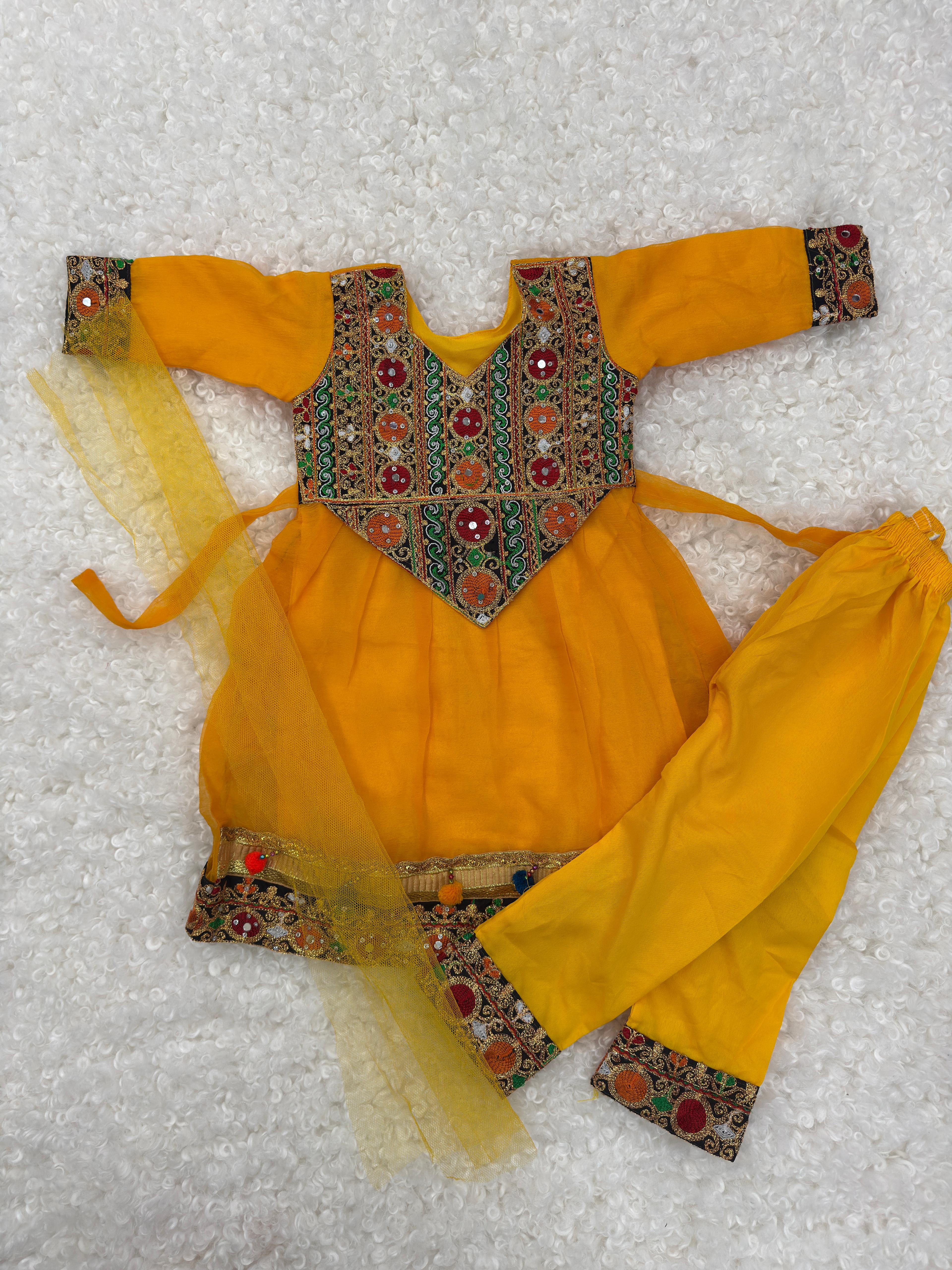 Girls 3 Piece Afghani Dress Set – Chiffon Embroidered Shirt, Crepe Trousers & Net Dupatta with Tassels