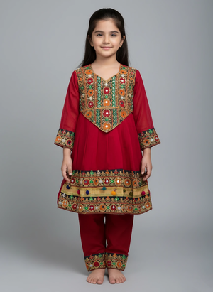 Home Girls Red color Girls Traditional Afghani Outfit – 3 Piece Chiffon Embroidered Dress Set