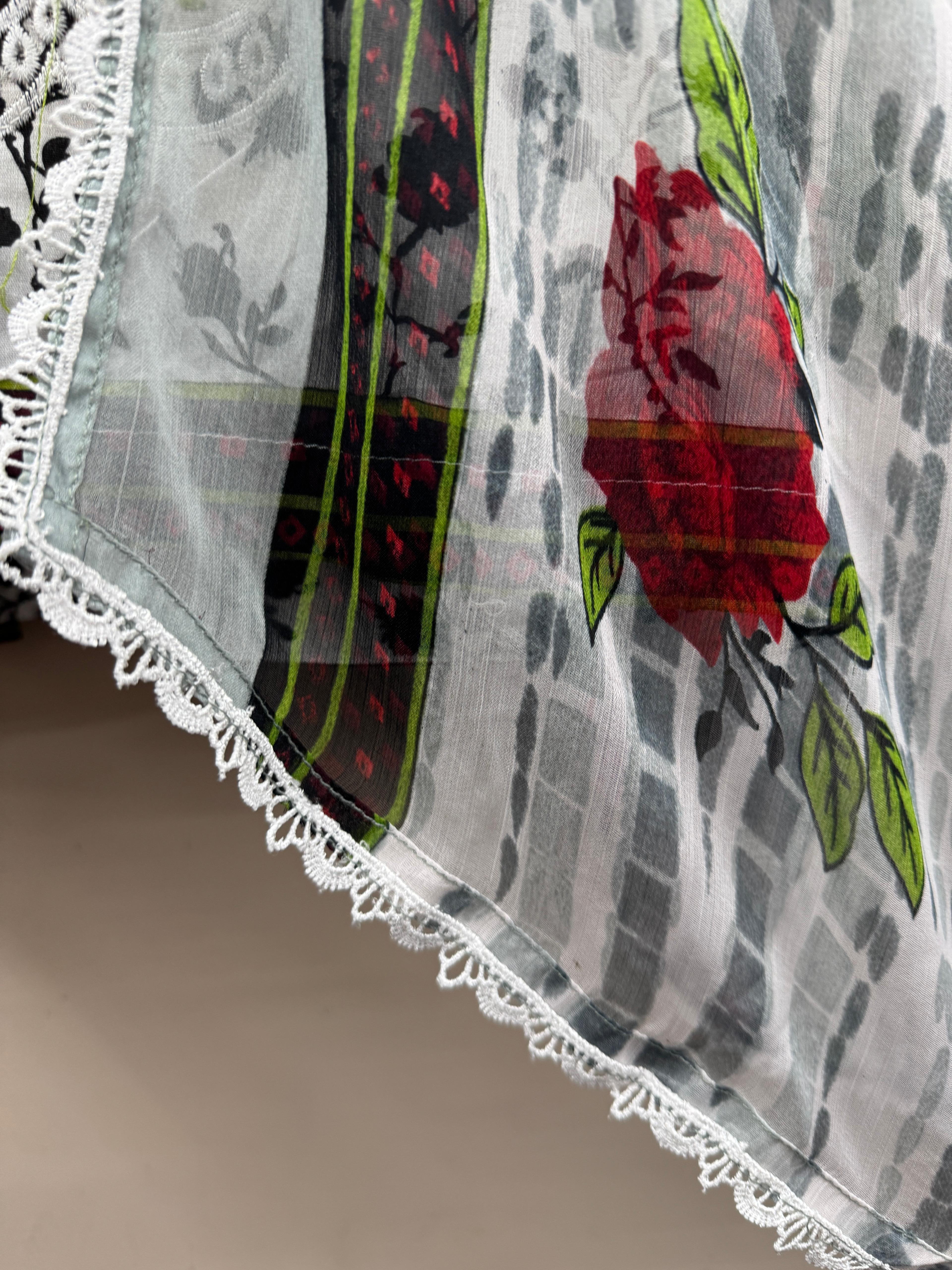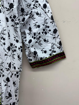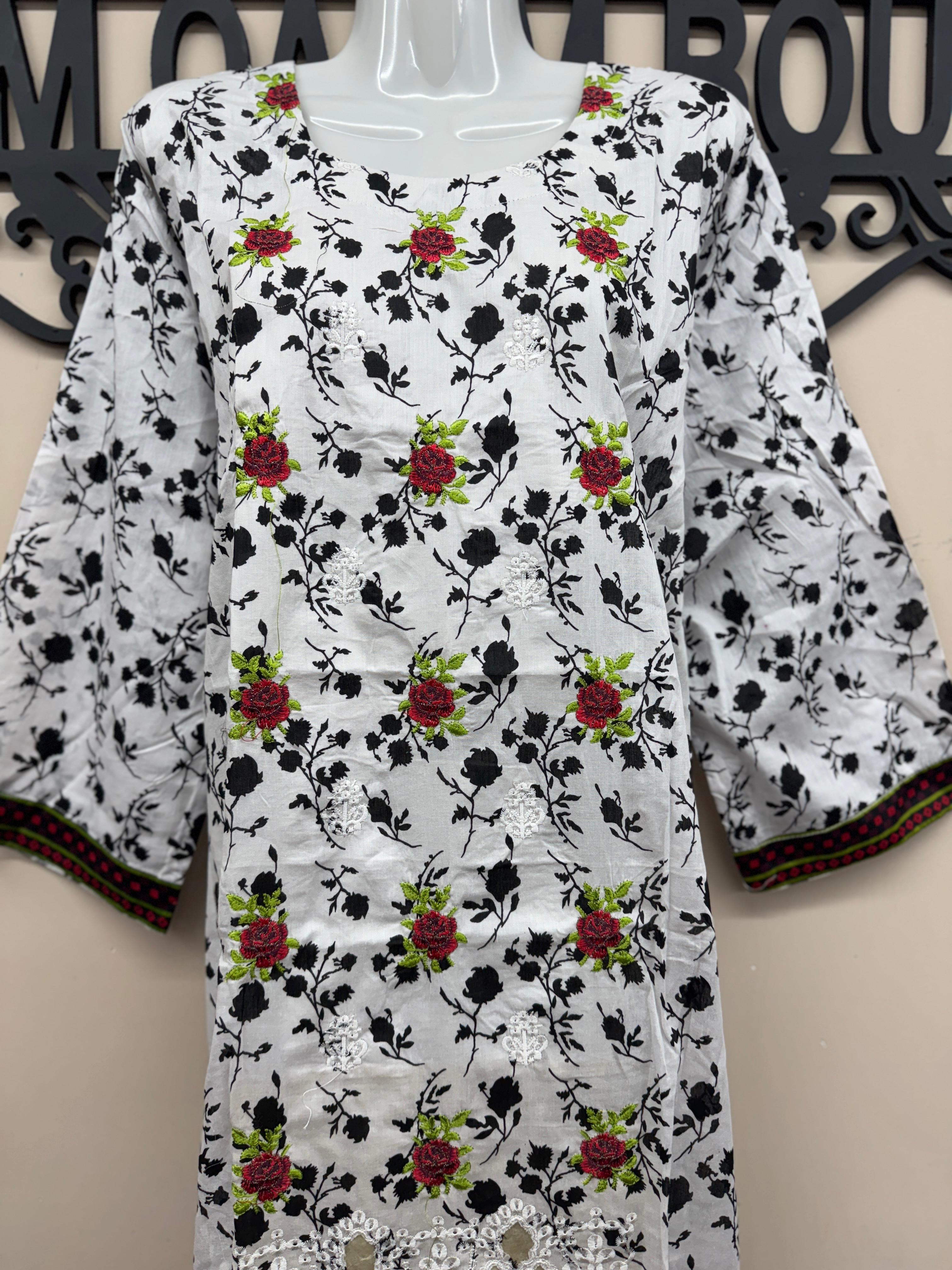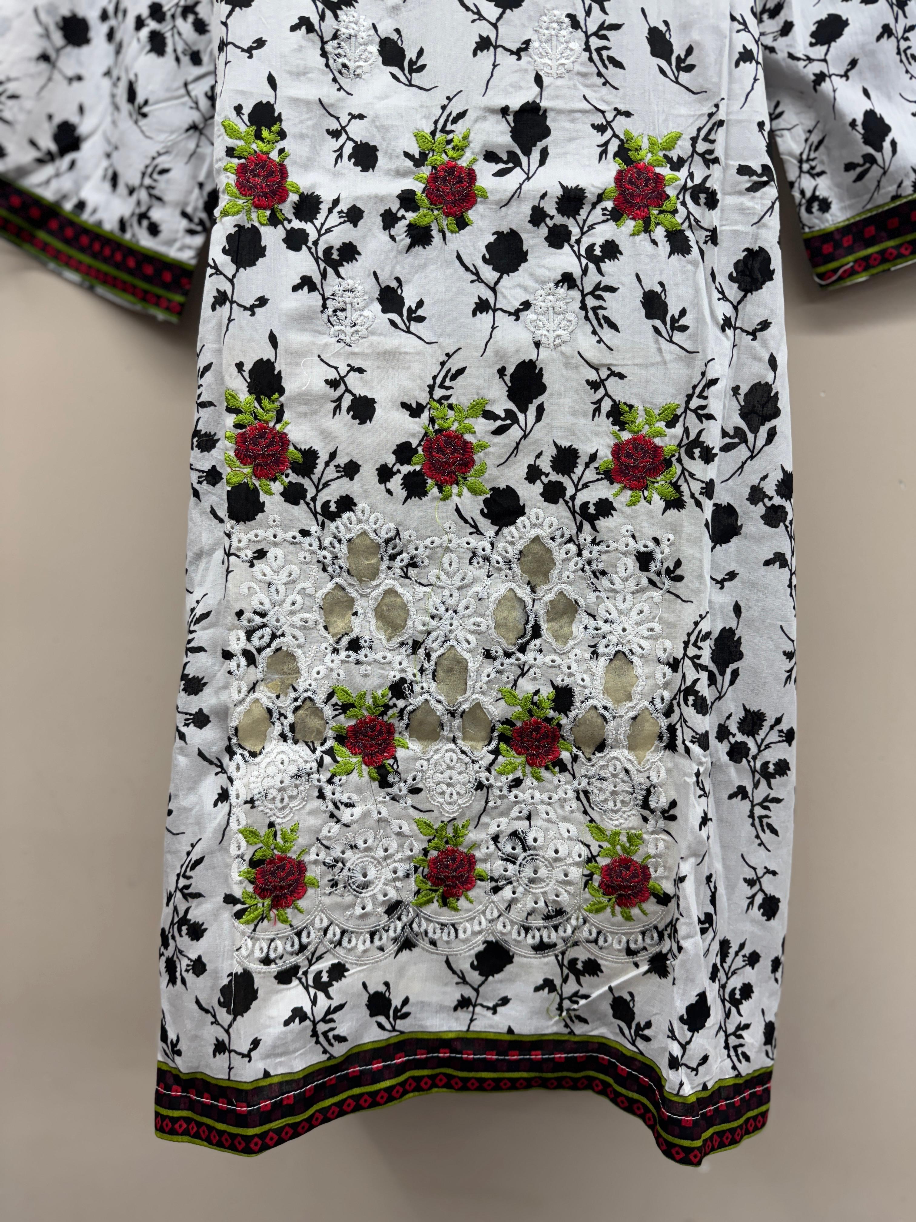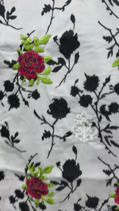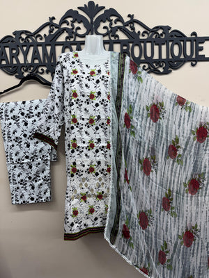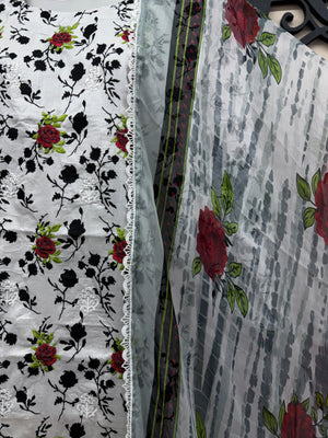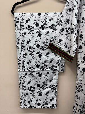 Make a bold style statement with this black and green 3-piece lawn outfit designed with elegance and comfort in mind. The shirt features a striking floral print with detailed front embroidery, paired with matching lawn trousers for a complete look. The outfit is beautifully finished with a printed chiffon dupatta, adding flow and grace. Crafted from non-see-through breathable lawn fabric, this suit is perfect for summer wear. Manufactured by Erum Eman