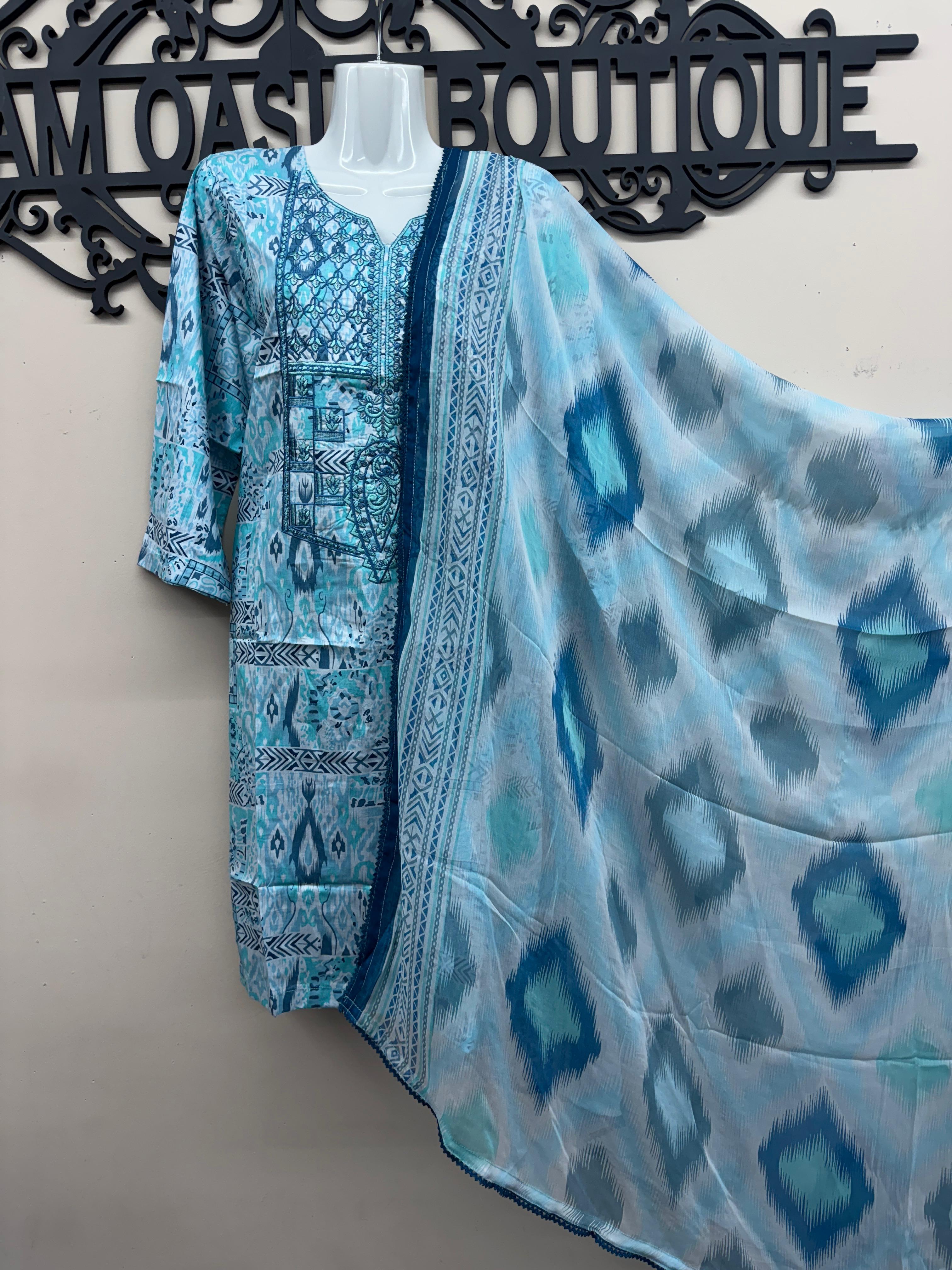 Refresh your wardrobe with this stylish blue 3-piece lawn outfit, featuring a printed lawn shirt with embroidered neckline and geometric patterns, paired with a plain matching lawn trouser for balance. The lightweight chiffon dupatta with blue-toned digital print and four-sided lace finishing adds a graceful touch. Made with breathable non-see-through fabric, this outfit is perfect for daily wear or casual gatherings. Manufactured by Erum Eman