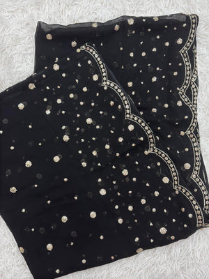 • Chiffon Dupatta: Complementing black chiffon dupatta, fully embroidered with zari and sequins, bordered on two sides to complete the graceful look.