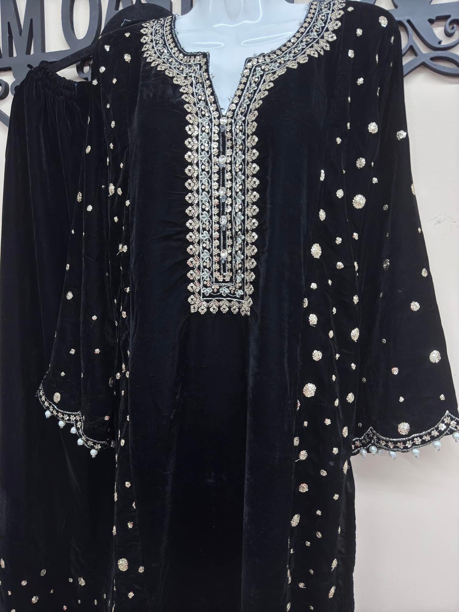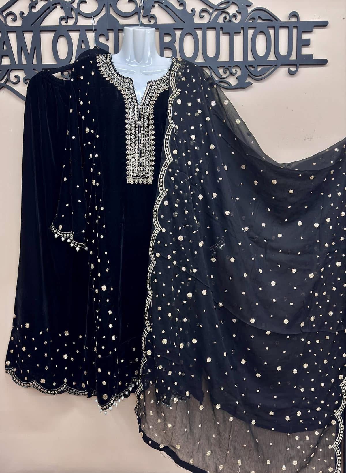 Home Maryam Qasim Boutique Elegant Black 3-Piece Velvet Embroidered Ensemble for Women – Luxury Formal Wear with Chiffon Dupatta