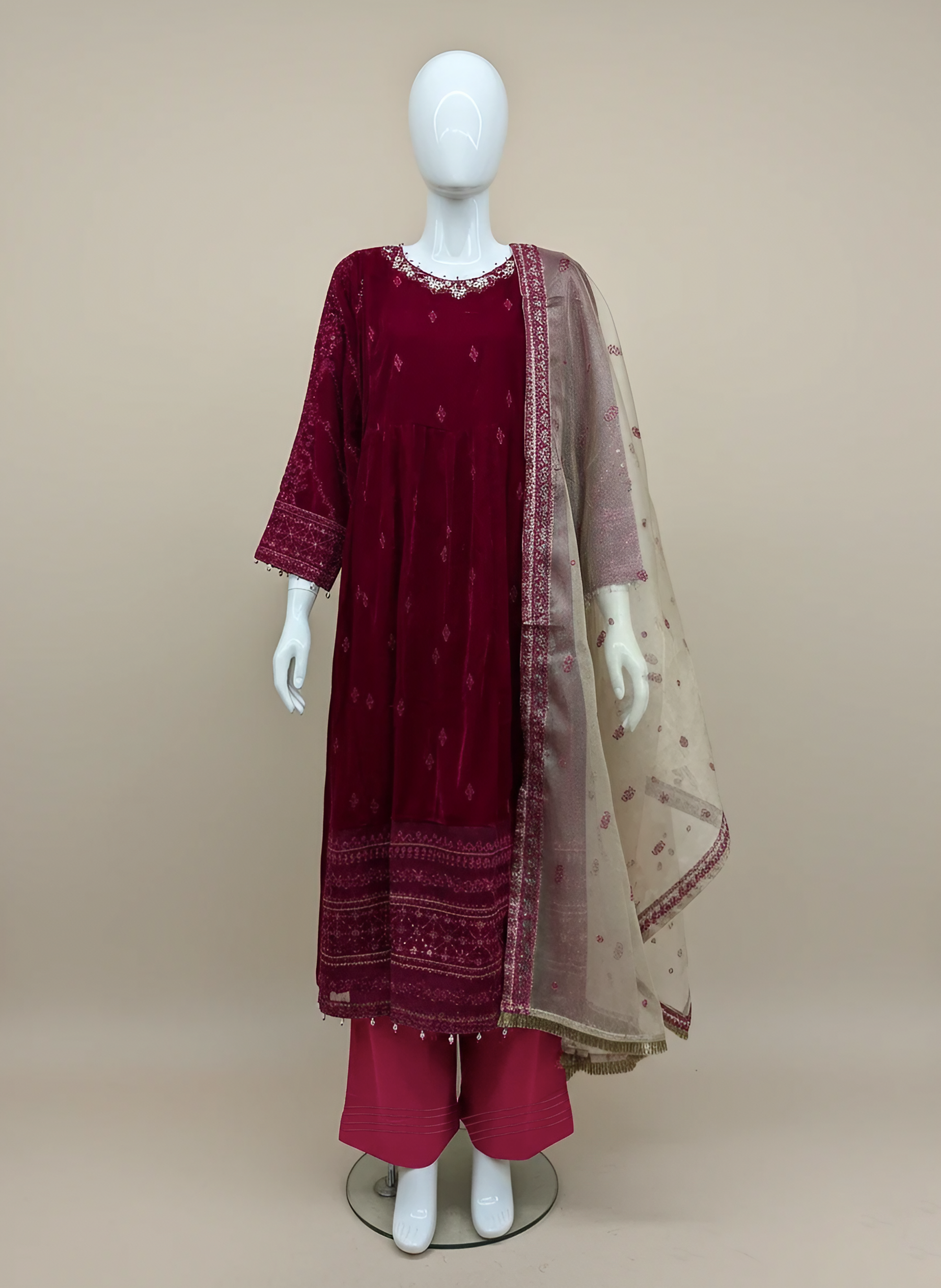 Micro Velvet Maxi: Made from 9000 micro velvet, this long red maxi features hand-embroidered neckline detailing with sequins, beads, and zari work. The full embroidered sleeves and 11-inch organza border with sequin and bead embellishments add a graceful, festive charm.