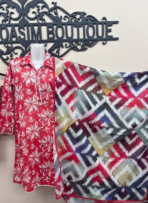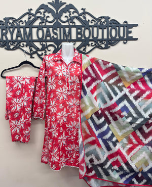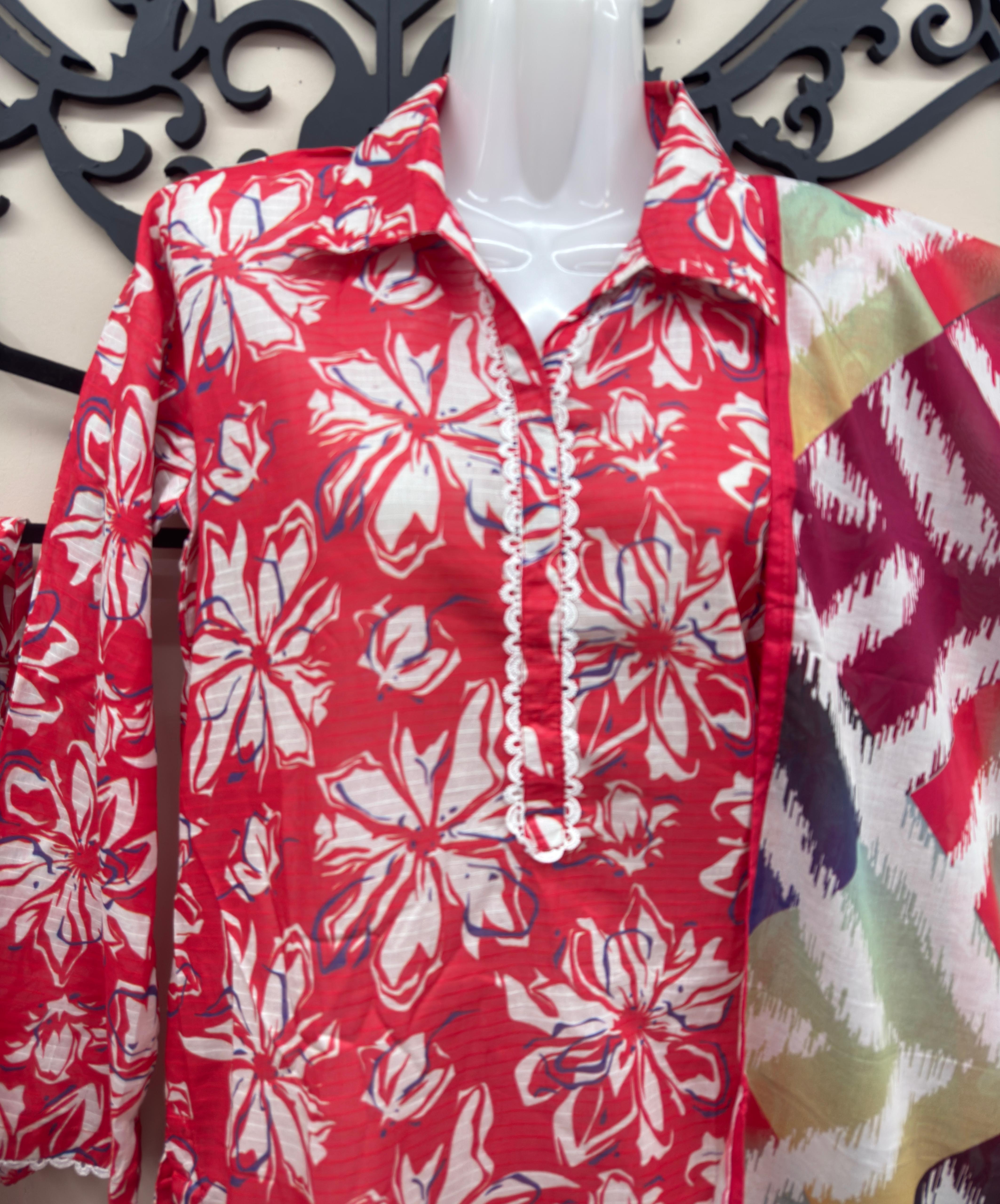3 Piece Printed Lawn Suit for Women – Summer Outfit with Lace Neck & Dupatta