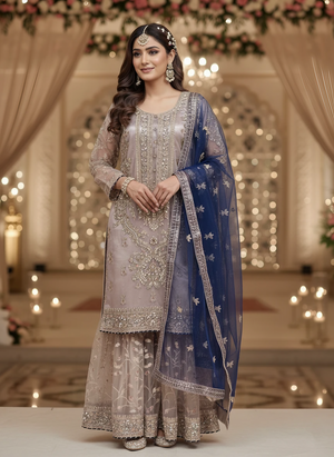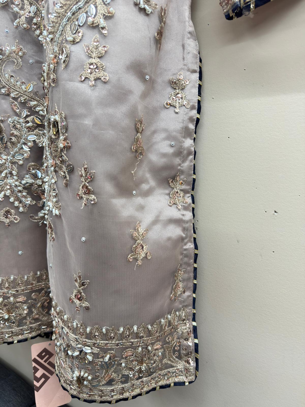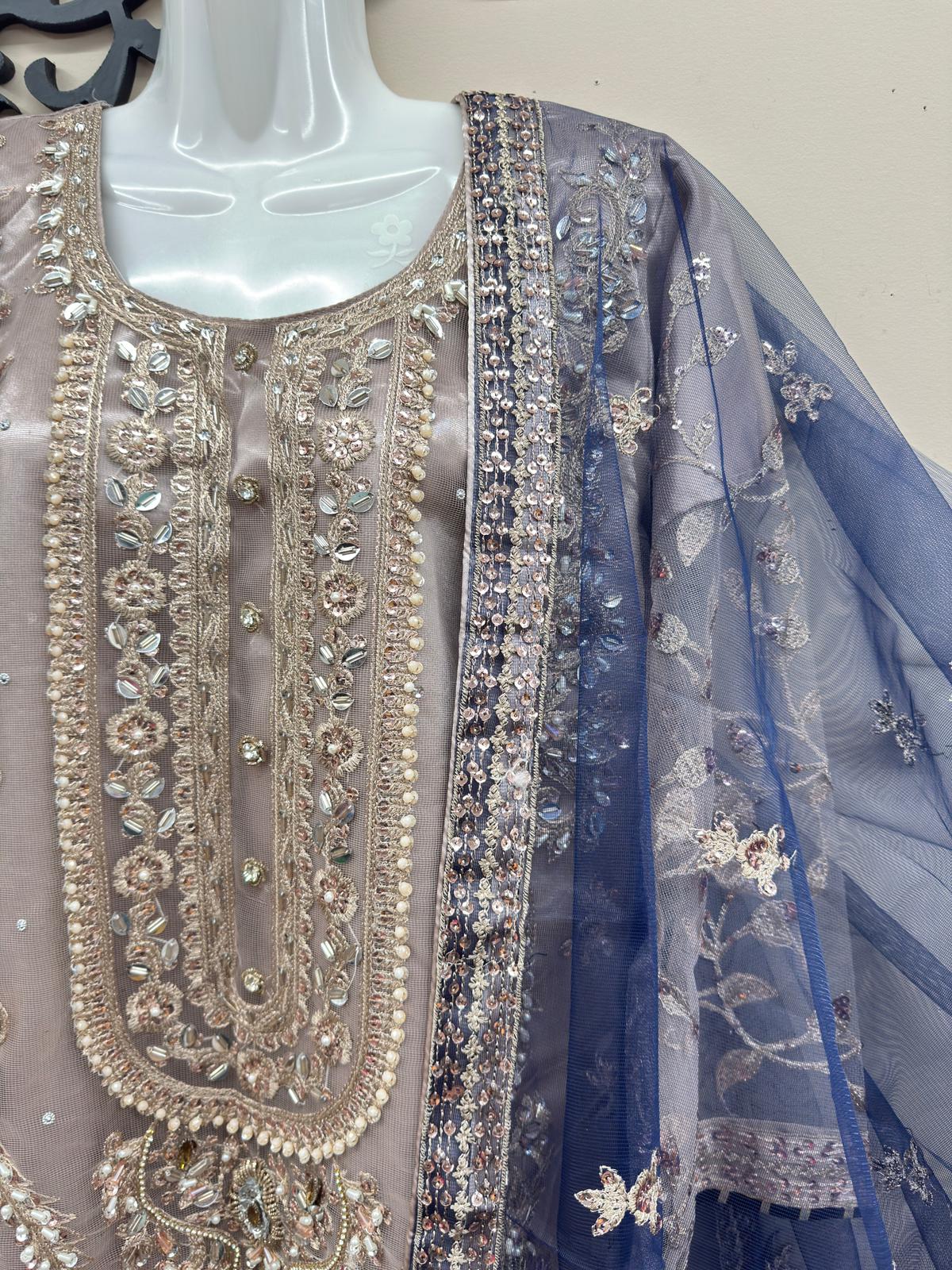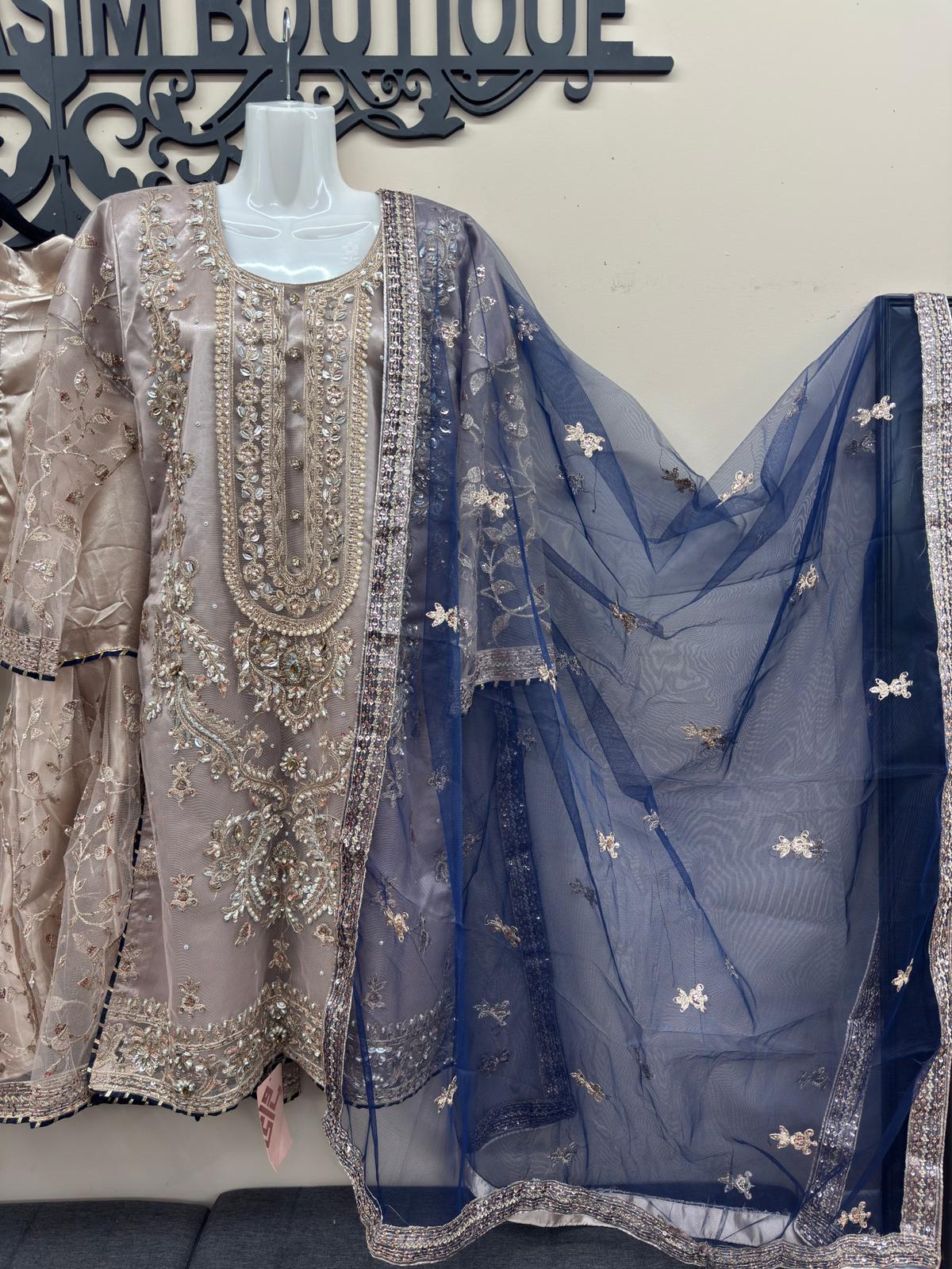 The shirt features full net embroidery over silk lining with intricate zari, sequins, hand-attached beads, Cora, and tilla work. Finished with blue dori piping, the dress maintains a refined designer look. Paired with a matching same-material silk embroidered gharara and a navy blue net dupatta with four-side embroidered borders, the outfit delivers a complete regal appearance.