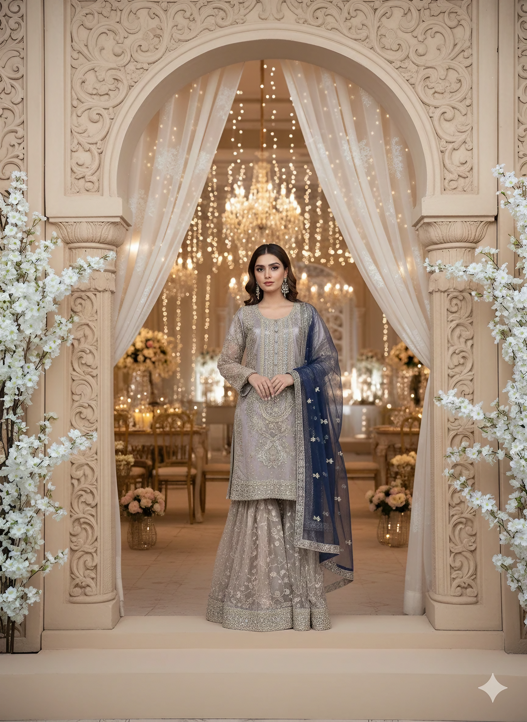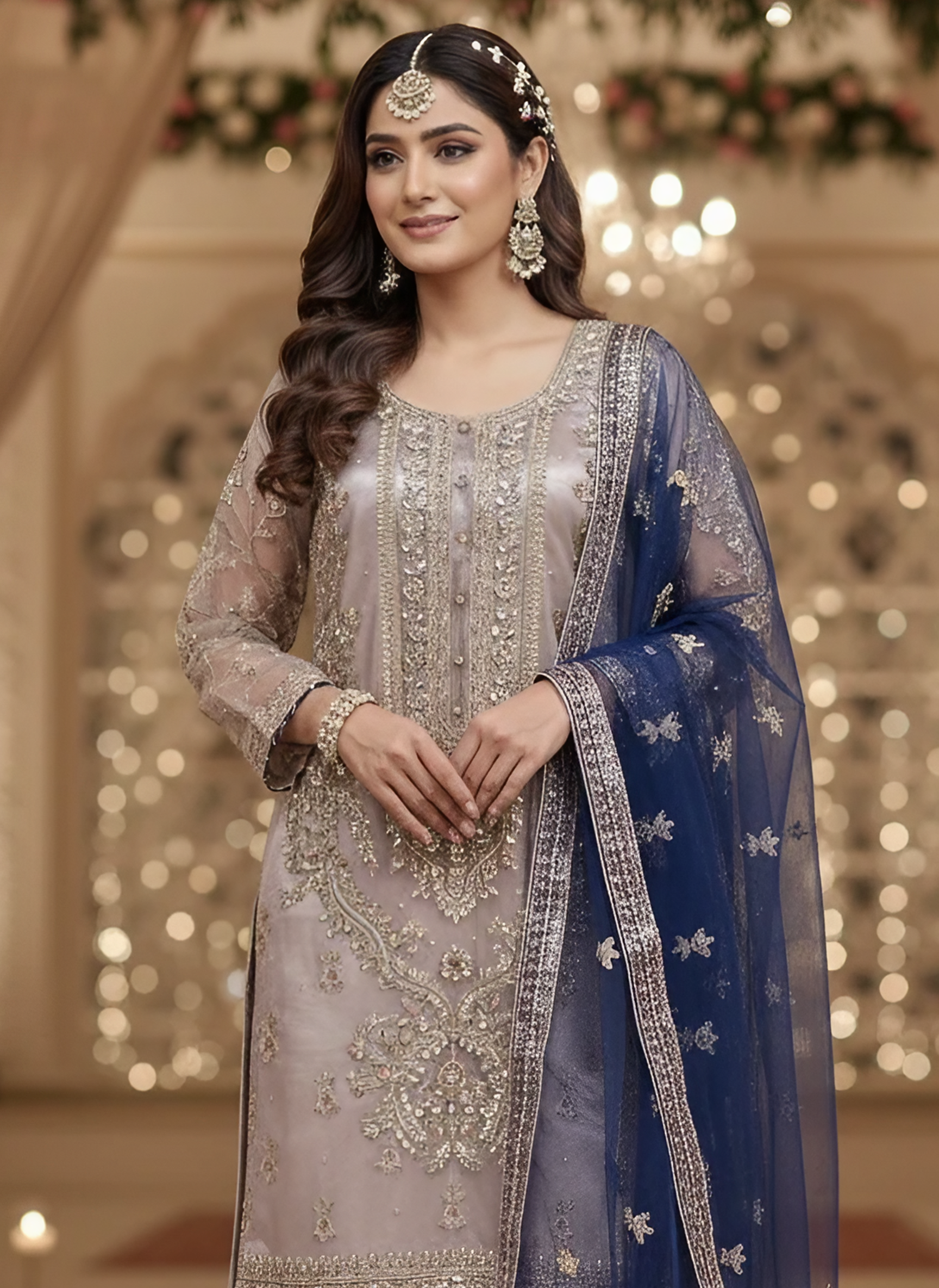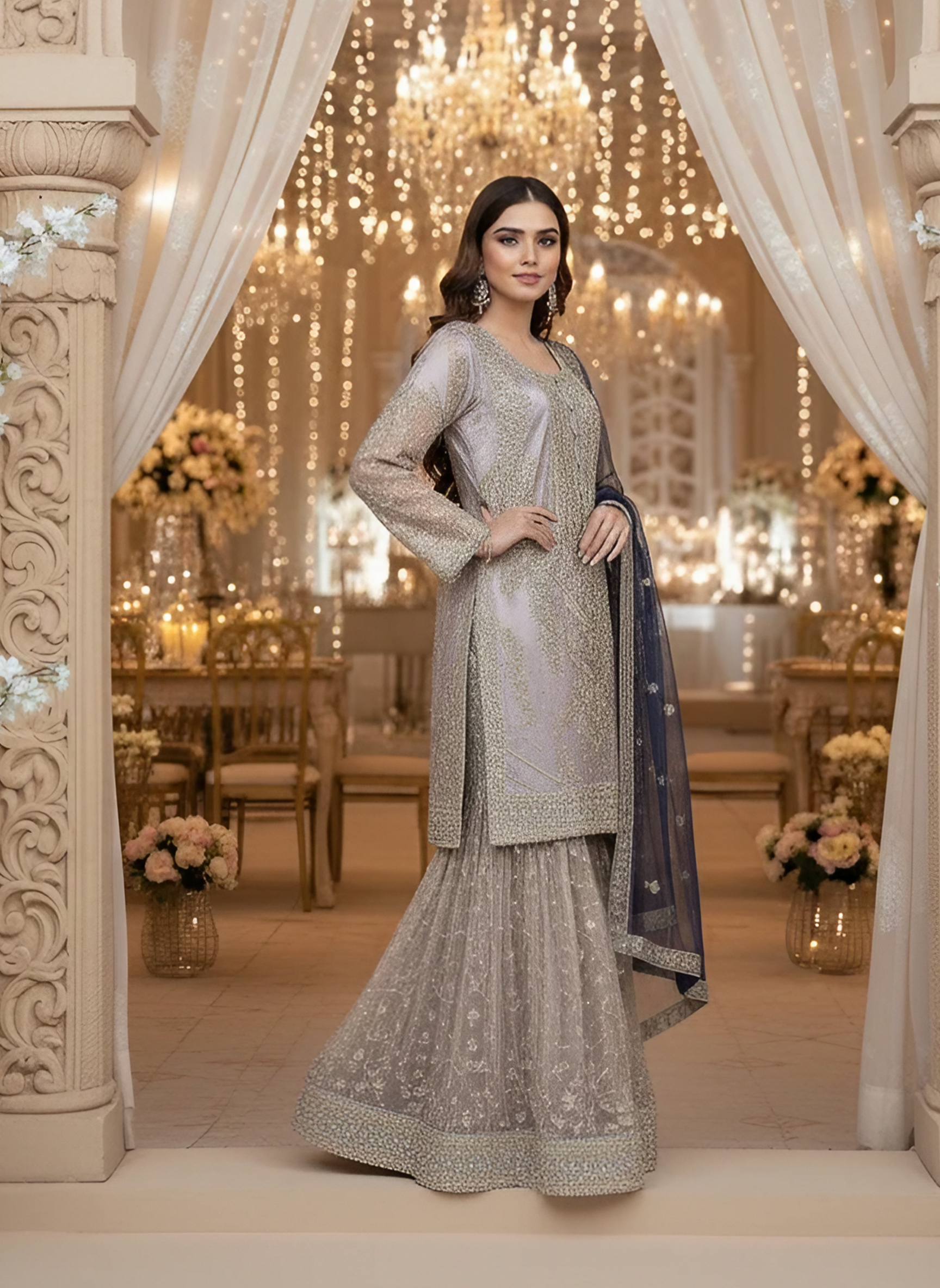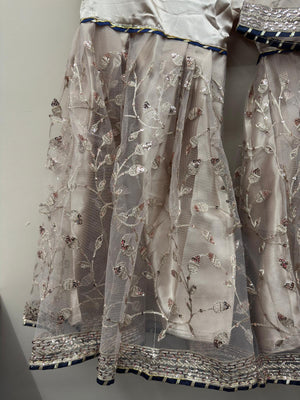 The shirt features full net embroidery over silk lining with intricate zari, sequins, hand-attached beads, Cora, and tilla work. Finished with blue dori piping, the dress maintains a refined designer look. Paired with a matching same-material silk embroidered gharara and a navy blue net dupatta with four-side embroidered borders, the outfit delivers a complete regal appearance.