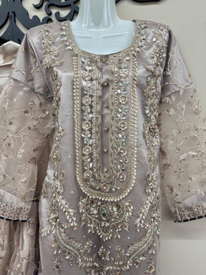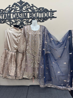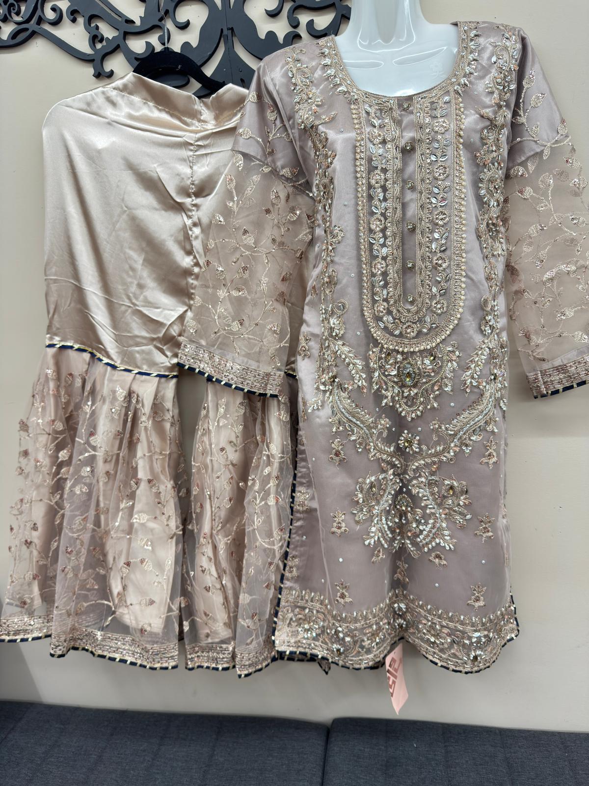 Introducing this premium formal 3-piece silk and net embroidered gharara outfit, designed with rich traditional detailing and elegant craftsmanship. Made for festive events, formal gatherings, and evening wear, this outfit blends luxury with cultural charm.