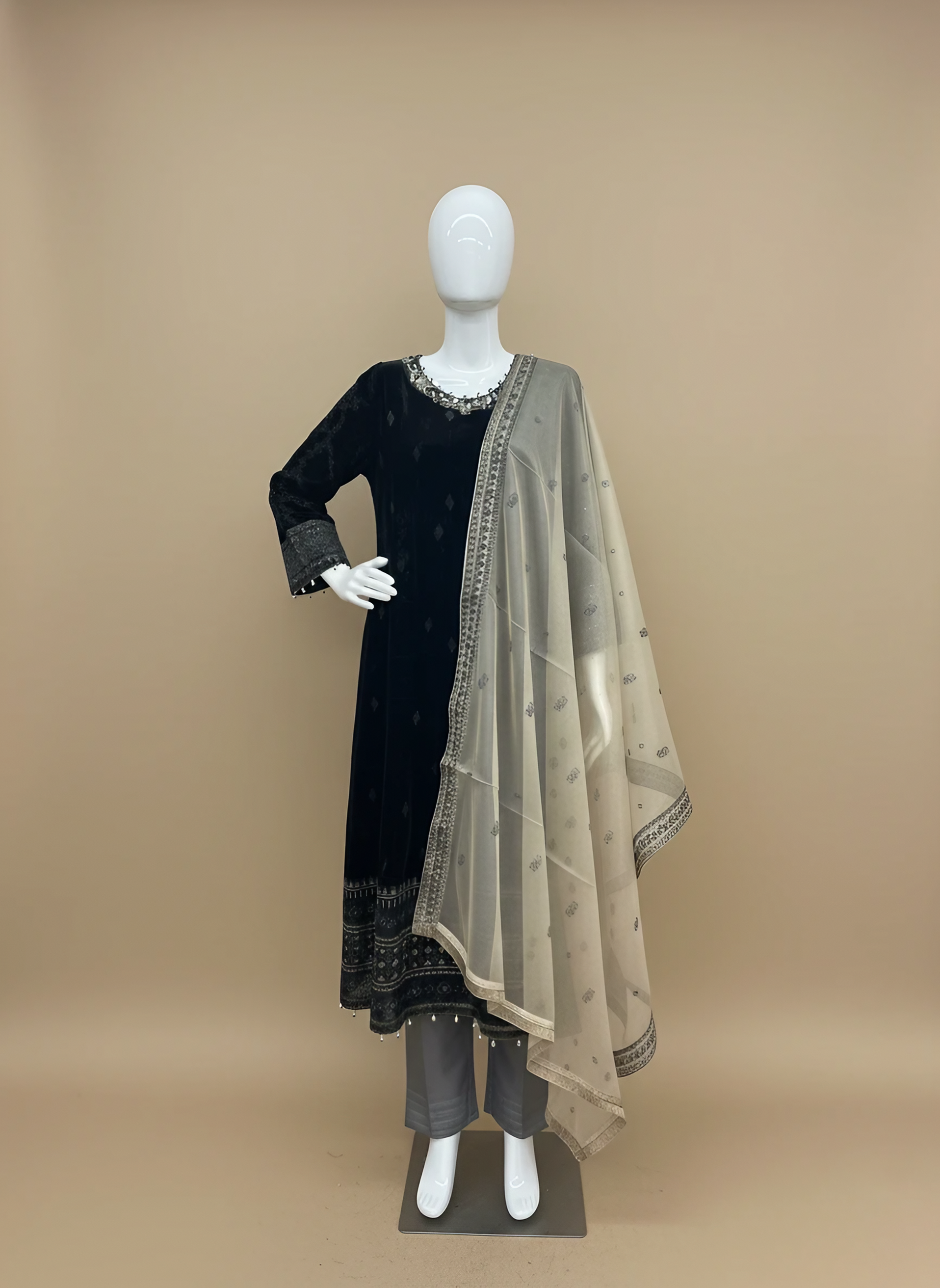 Micro Velvet Maxi: Tailored from 9000 micro velvet, this long black maxi features delicate hand embroidery on the neckline with sequins, beads, and zari work. The full embroidered sleeves and 11-inch organza border finished with intricate sequin and beadwork create a luxurious look.
