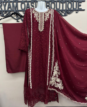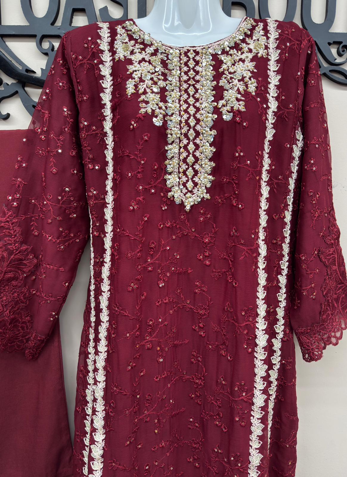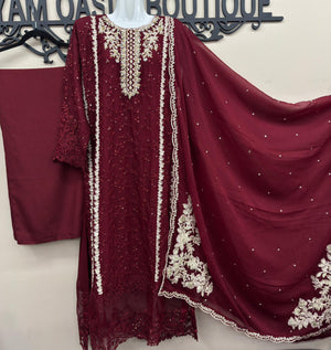 3 Pcs Red Chiffon Embroidered Suit with Fully Lined Shirt & Dupatta