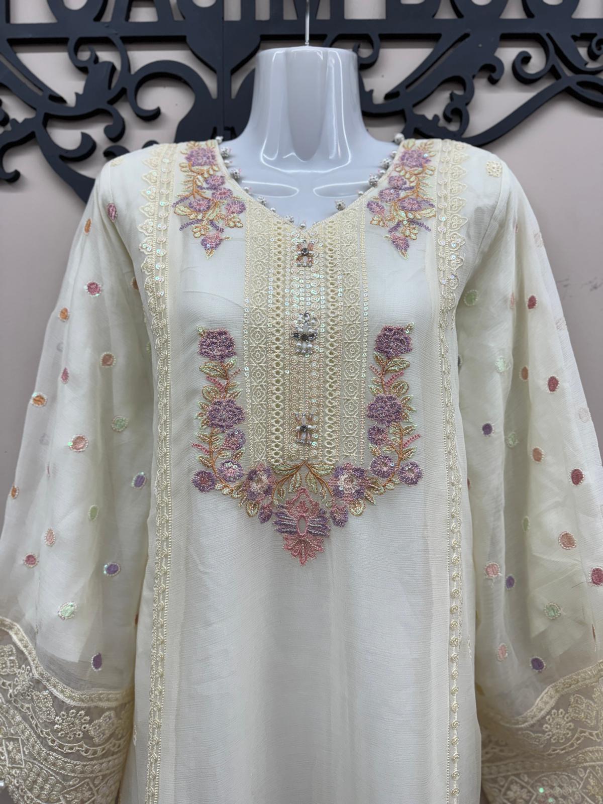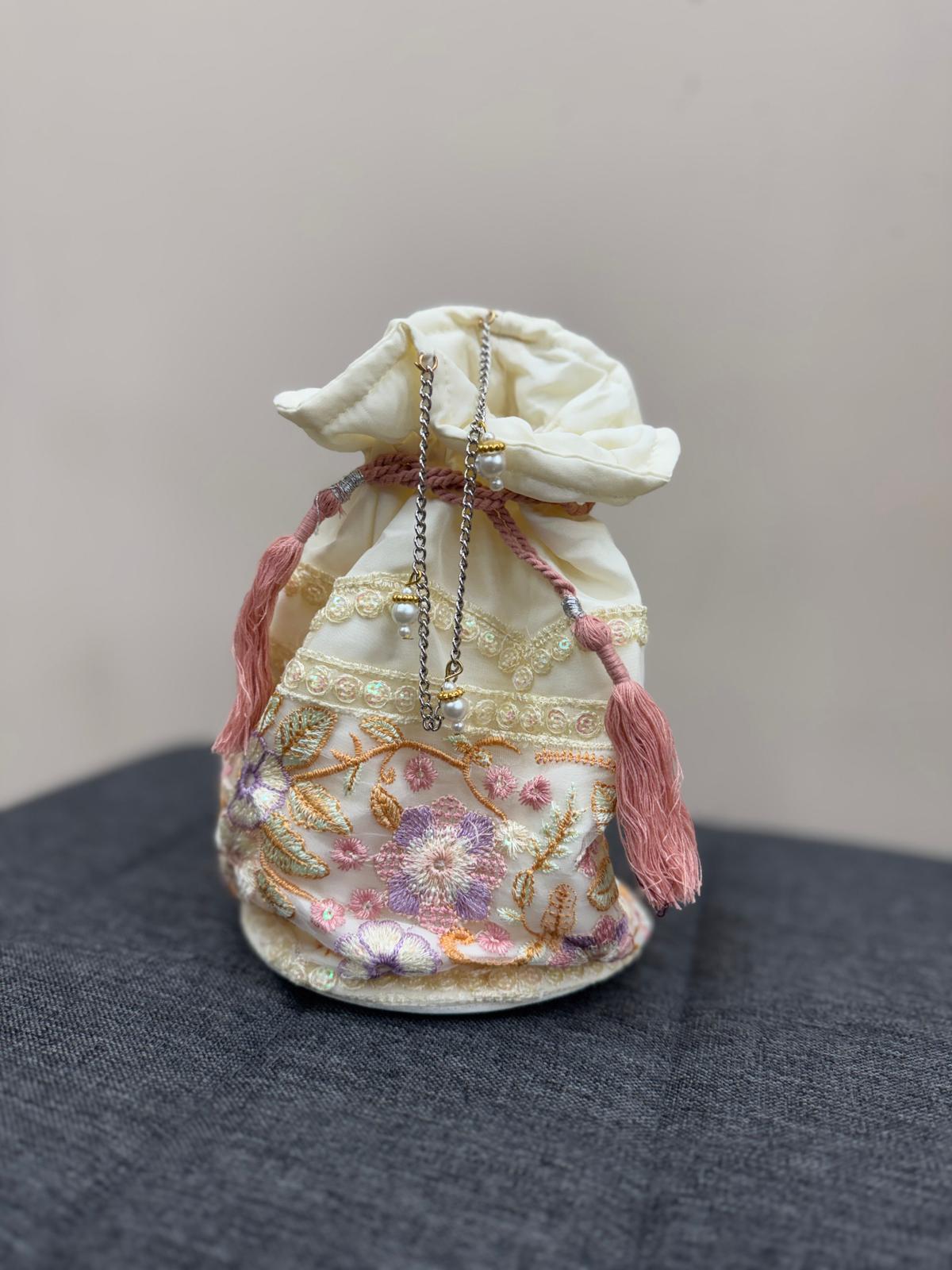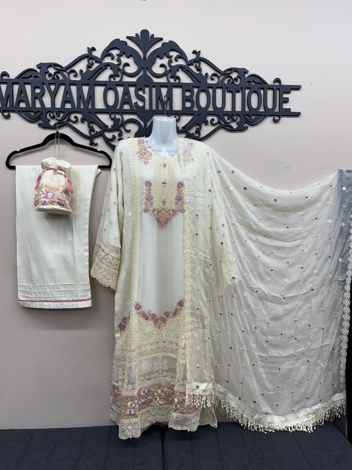 4 Pcs Formal Chiffon Embroidered Suit with Potli Bag