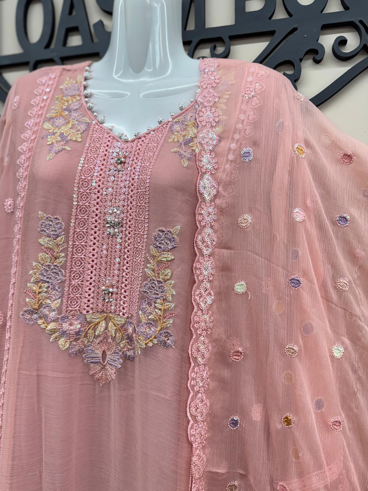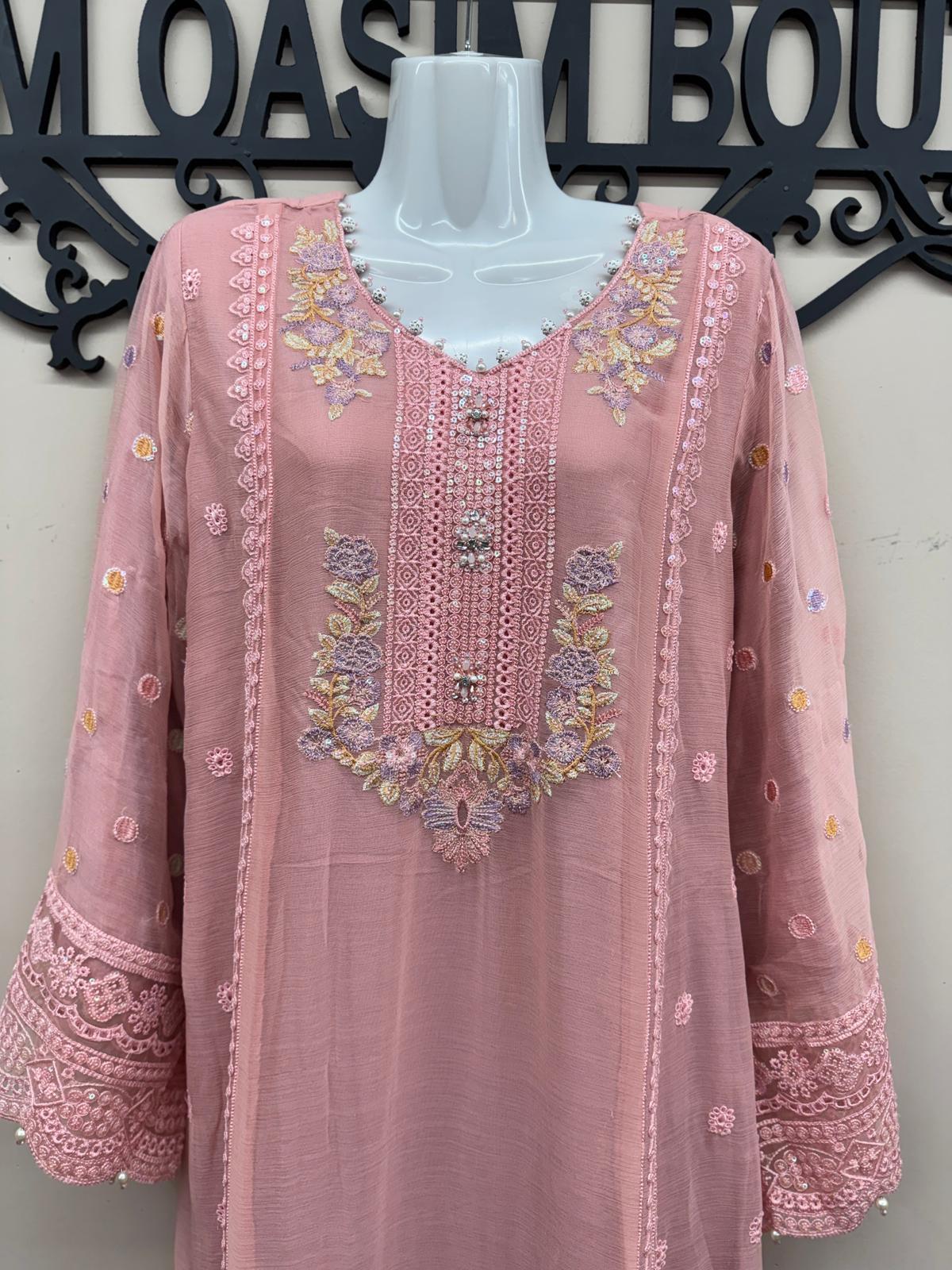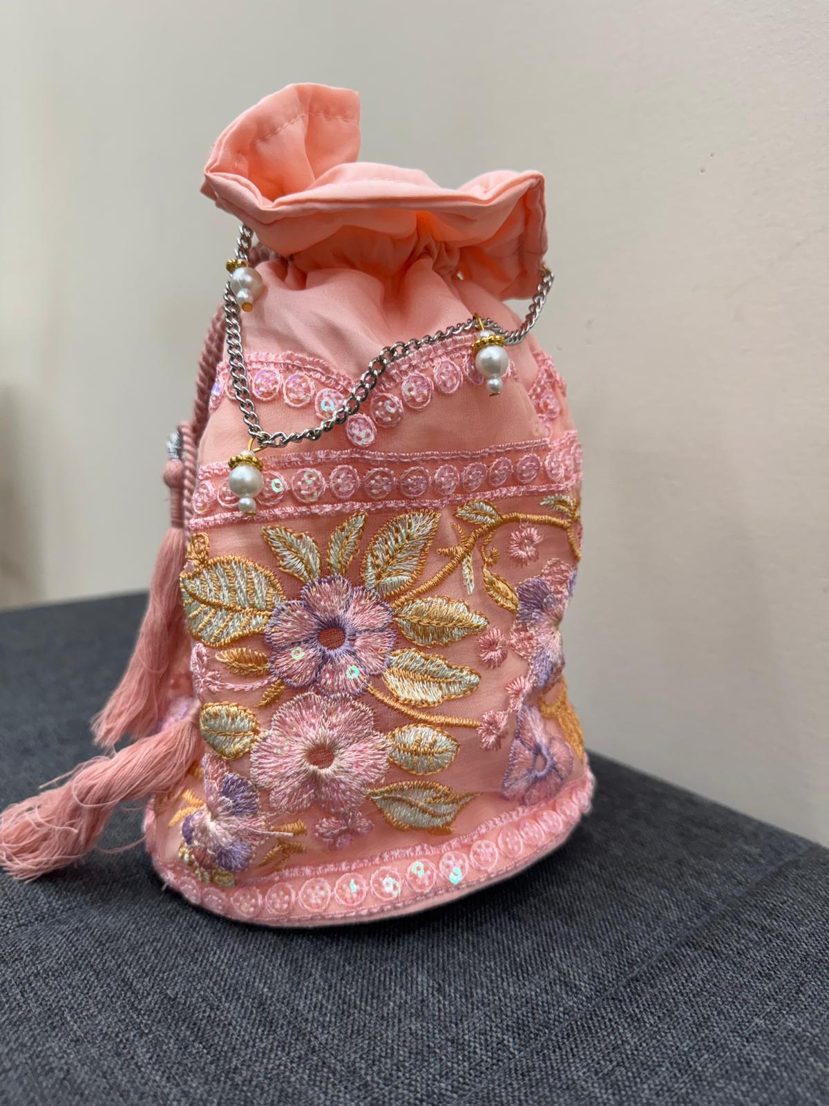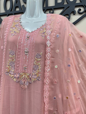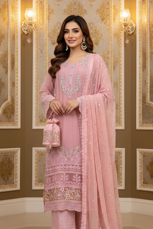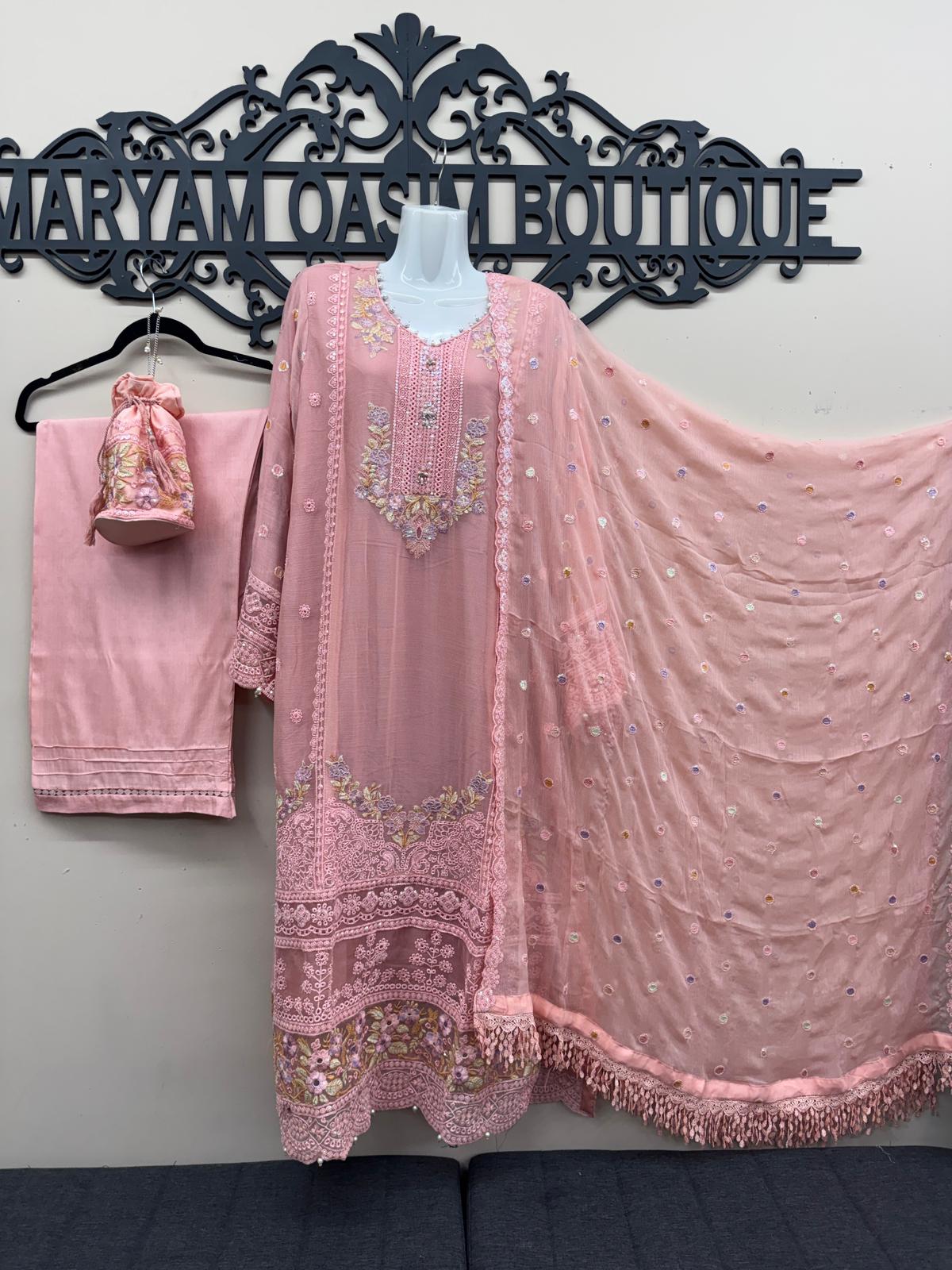 4 Pcs Pink Formal Chiffon Embroidered Suit with Potli Bag