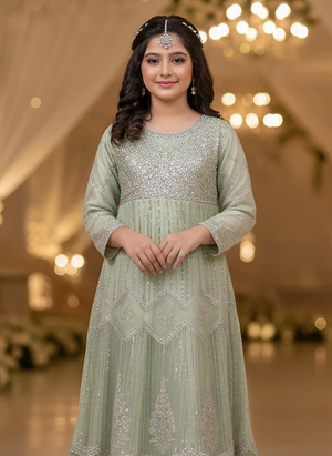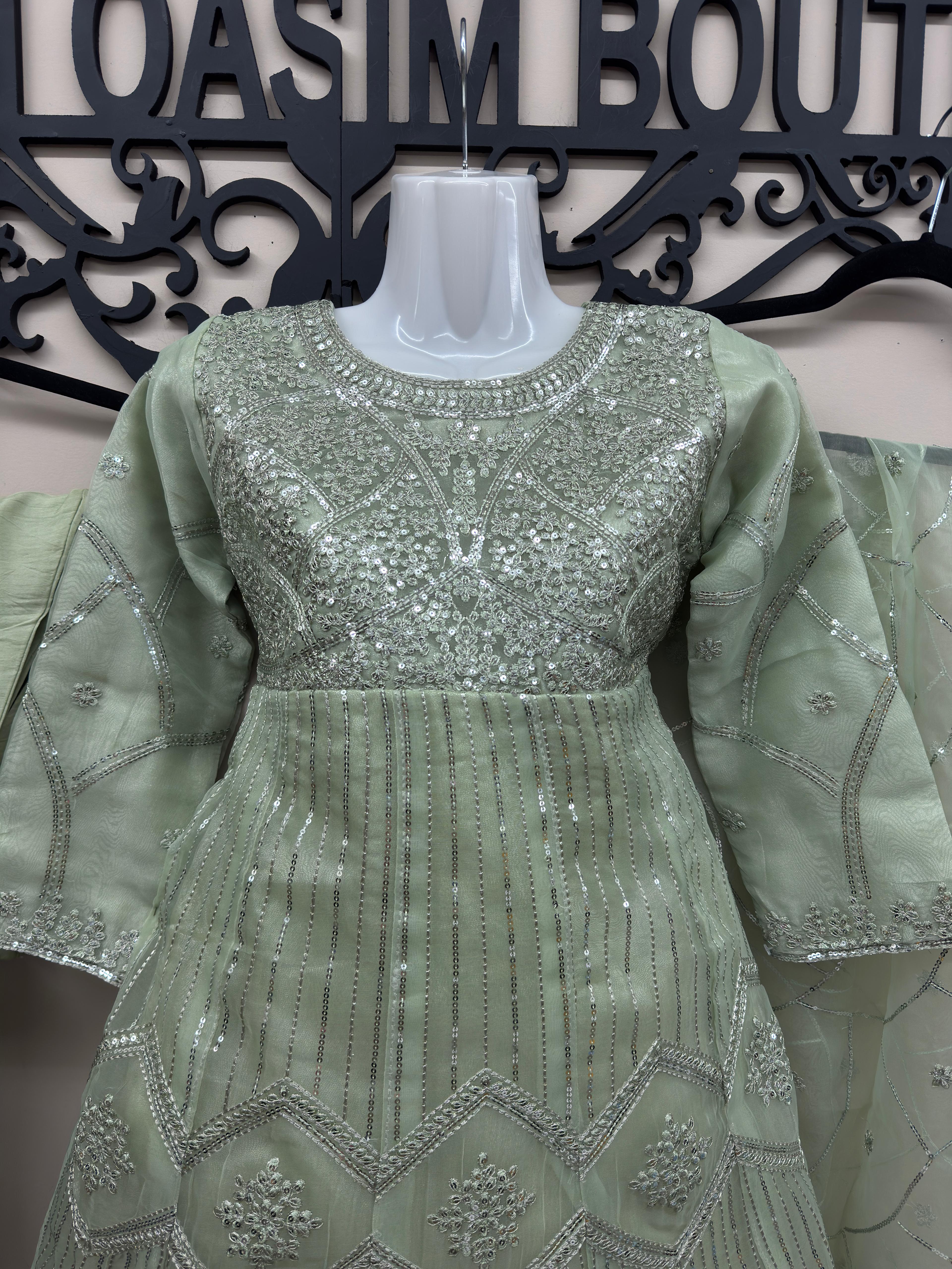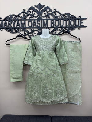 Girls Pista Green Heavy Embroidered Organza Anarkali Dress 3PC Set