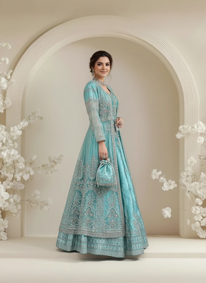 Step into elegance with this luxury 4-piece embroidered outfit, beautifully designed for weddings, parties, and premium festive events. This stunning set includes a silk embroidered blouse, fully embroidered lehenga, long net embroidered coat/gown, and a matching embroidered dupatta — finished with a stylish potli bag.