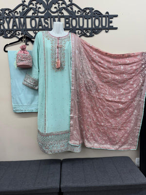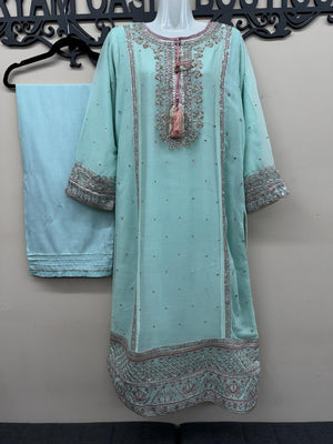 The fully embroidered chiffon dupatta adds a graceful touch, while the stitched raw silk trousers are designed with a wide cut and detailed with gota lace at the hem for a traditional look. A matching potli bag completes this designer-inspired ensemble, making it perfect for weddings, Eid, parties, or formal evening gatherings.