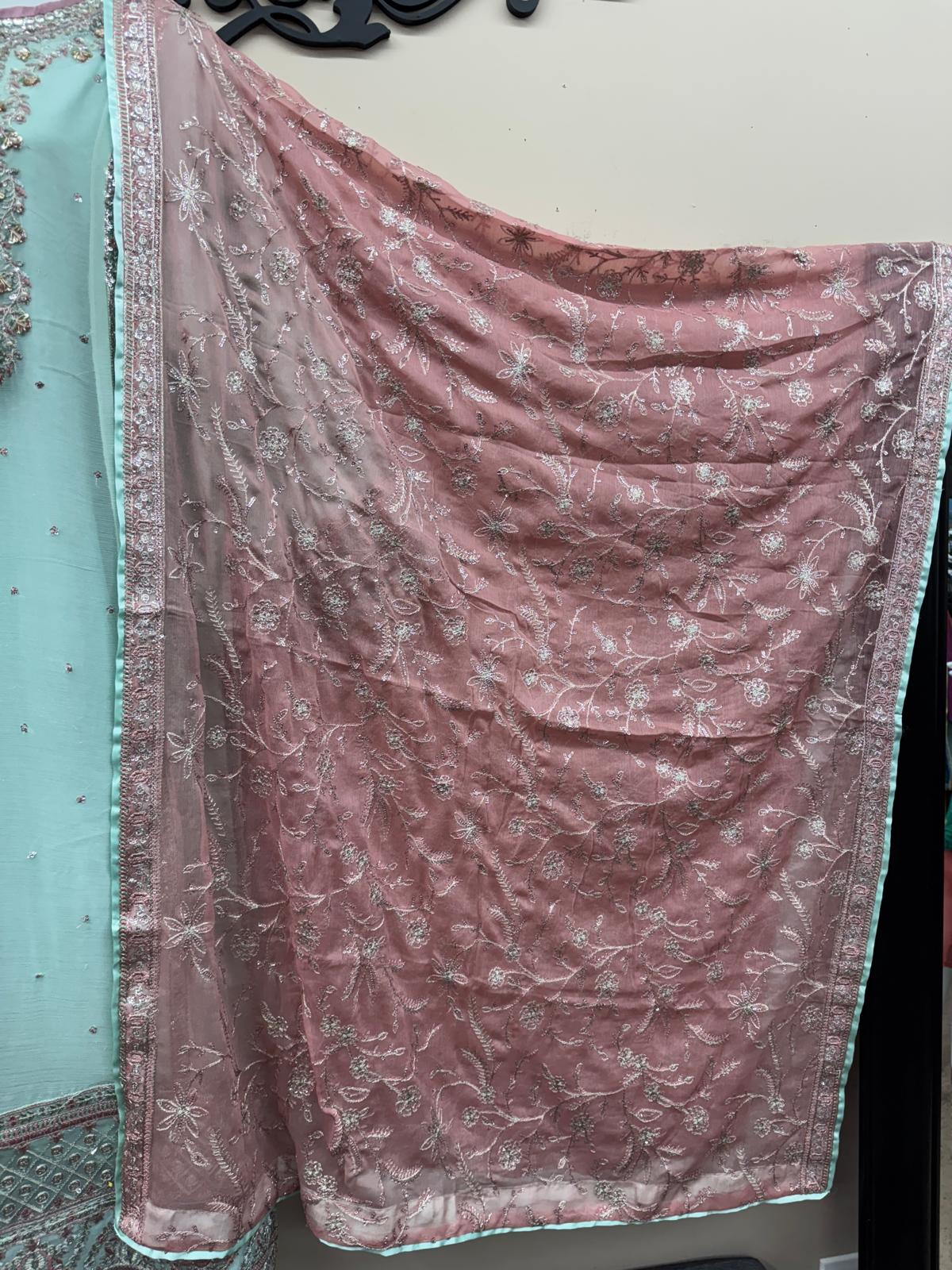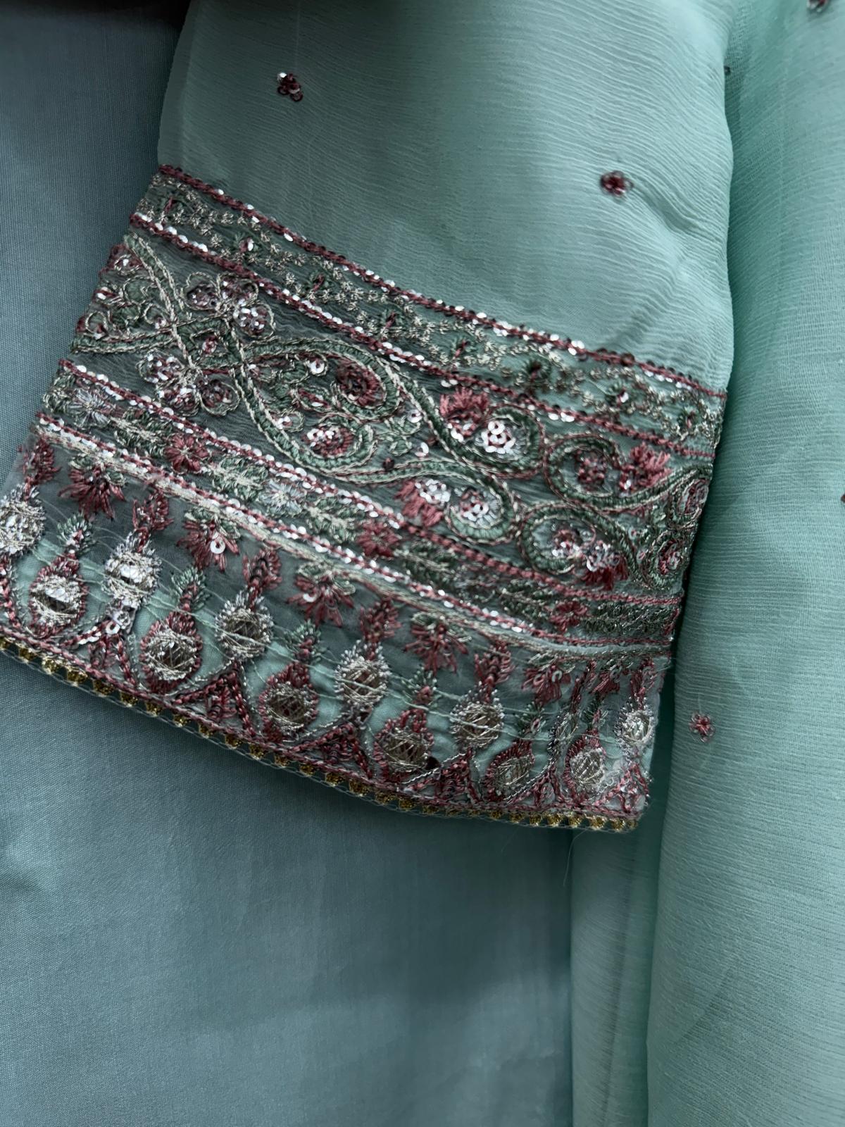 Indulge in timeless elegance with this stunning 4-piece formal chiffon outfit, crafted to bring sophistication and grace to your wardrobe. The shirt features intricate machine embroidery complemented by hand embellishments, including motif detailing with sequins, beads, and threadwork that radiates luxury.