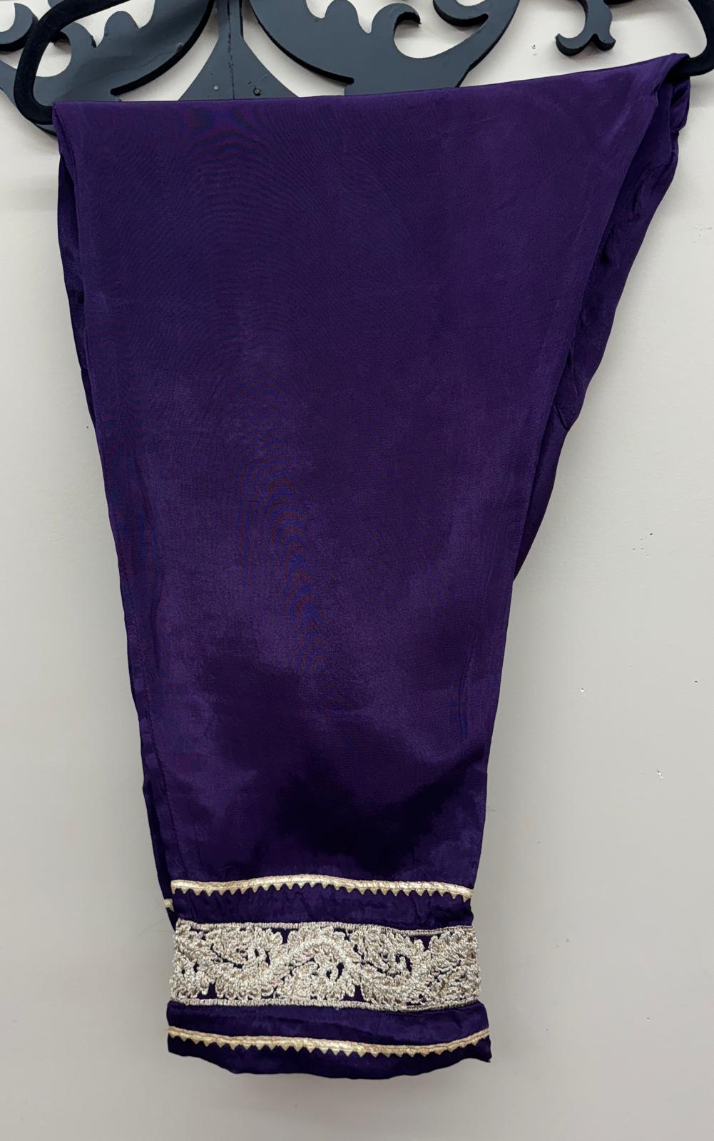 Elevate your style with our exquisite Purple 3-piece chiffon embroidered outfit, designed for elegance and grace. This stunning attire features intricate zari, jams, and stone embroidery, creating a luxurious and captivating look. The shirt front is adorned with elaborate embroidery, while the plain back has a beautifully embroidered daman. The full-length sleeves are lined and delicately embellished, enhancing the sophisticated design.
