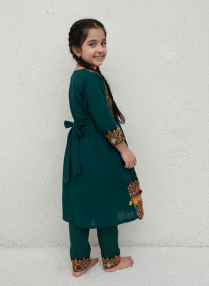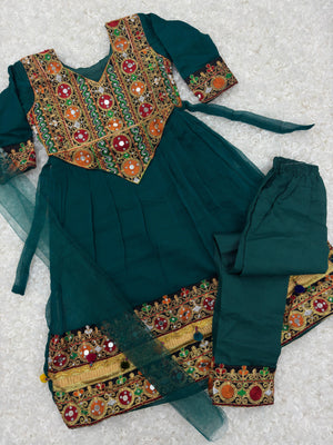 3 Piece Girls Party Wear Afghani Suit – Chiffon Embroidery with Tassels