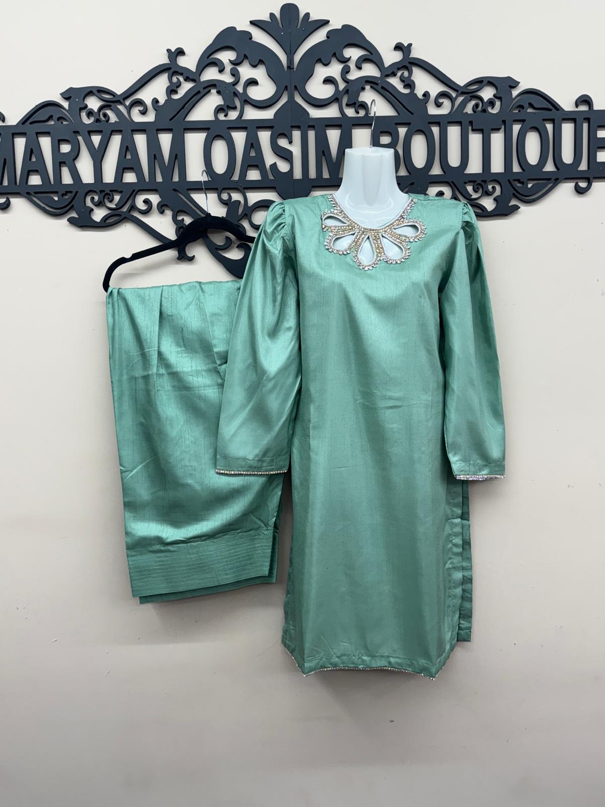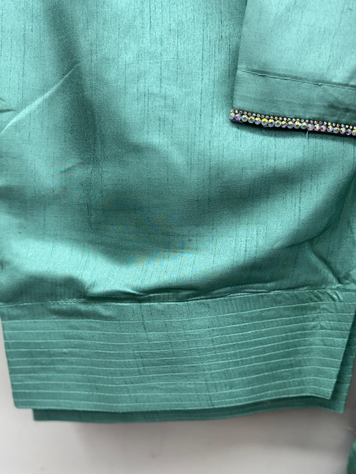 Home 3-Piece Suits Cool-toned Green Kattan Silk 3Pc Farshi Suit – Hand Embroidered