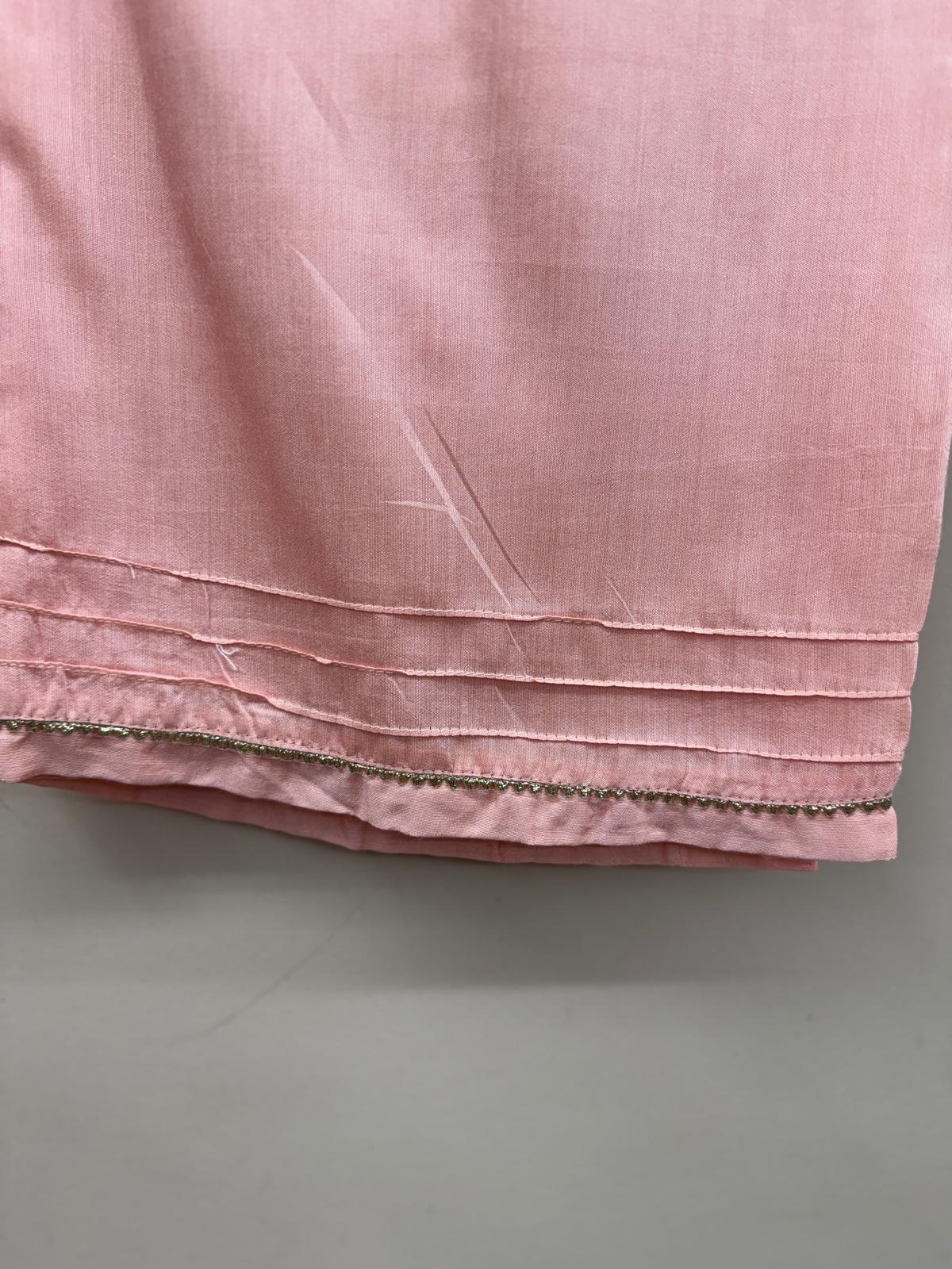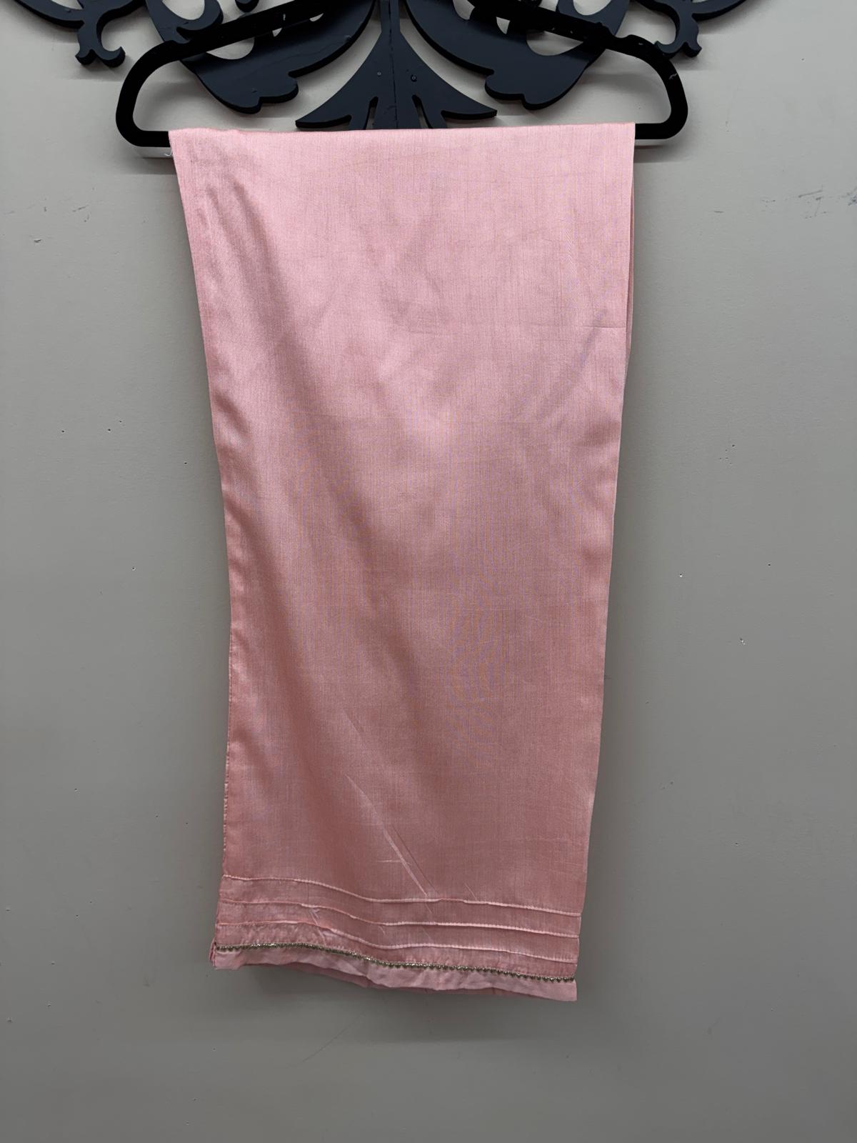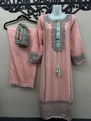 The fully embroidered chiffon dupatta adds a graceful touch, while the stitched raw silk trousers are designed with a wide cut and detailed with gota lace at the hem for a traditional look. A matching potli bag completes this designer-inspired ensemble, making it perfect for weddings, Eid, parties, or formal evening gatherings.