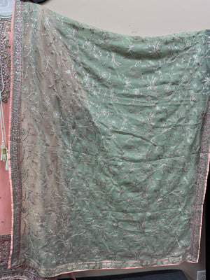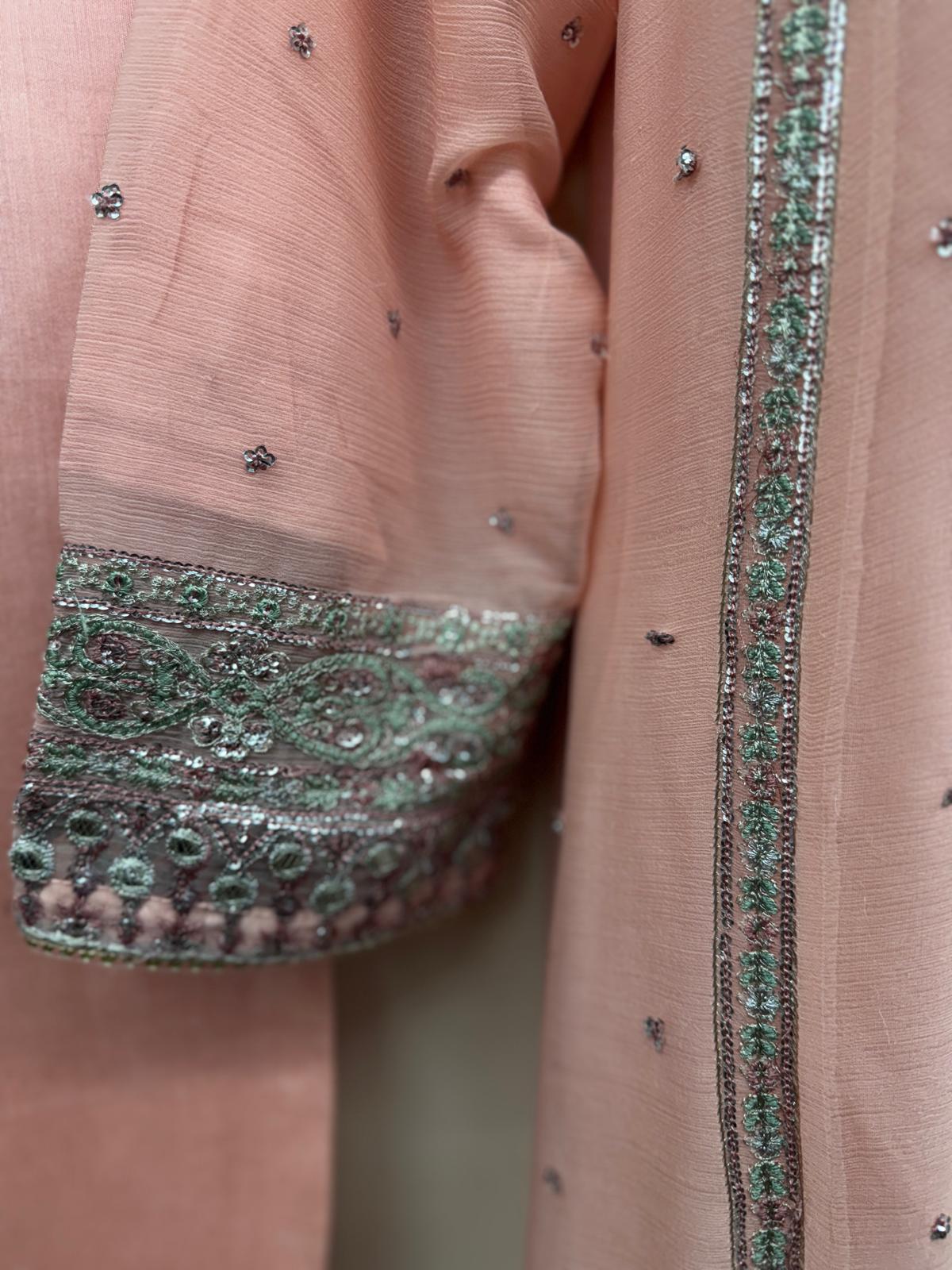 Indulge in timeless elegance with this stunning 4-piece formal chiffon outfit, crafted to bring sophistication and grace to your wardrobe. The shirt features intricate machine embroidery complemented by hand embellishments, including motif detailing with sequins, beads, and threadwork that radiates luxury.