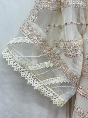 ✨ Top: Fully embroidered with sequins, zaree, nags, motis, and jamawar-style detailing. Lined with full sleeves and finished with lace stitching for a polished, designer look.