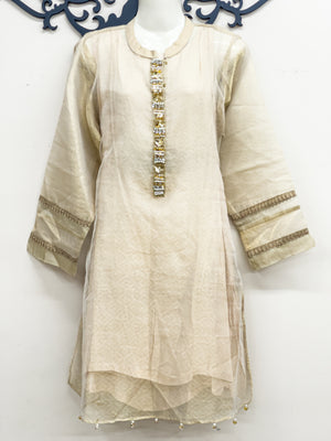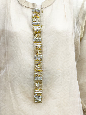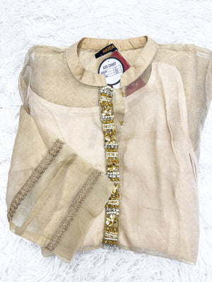 Discover the epitome of elegance with Maryam Qasim Boutique's WARDA brand luxury shirt. This masori net masterpiece boasts a beautiful hand-embroidered neckline, adding a touch of opulence to its sophisticated design. The shirt comes with a comfortable lining, while the sleeves are meticulously stitched and adorned with golden beige lace for a perfect blend of tradition and modernity. Elevate your style and make a statement at any special occasion with this exquisite creation that seamlessly combines grace and glamour.